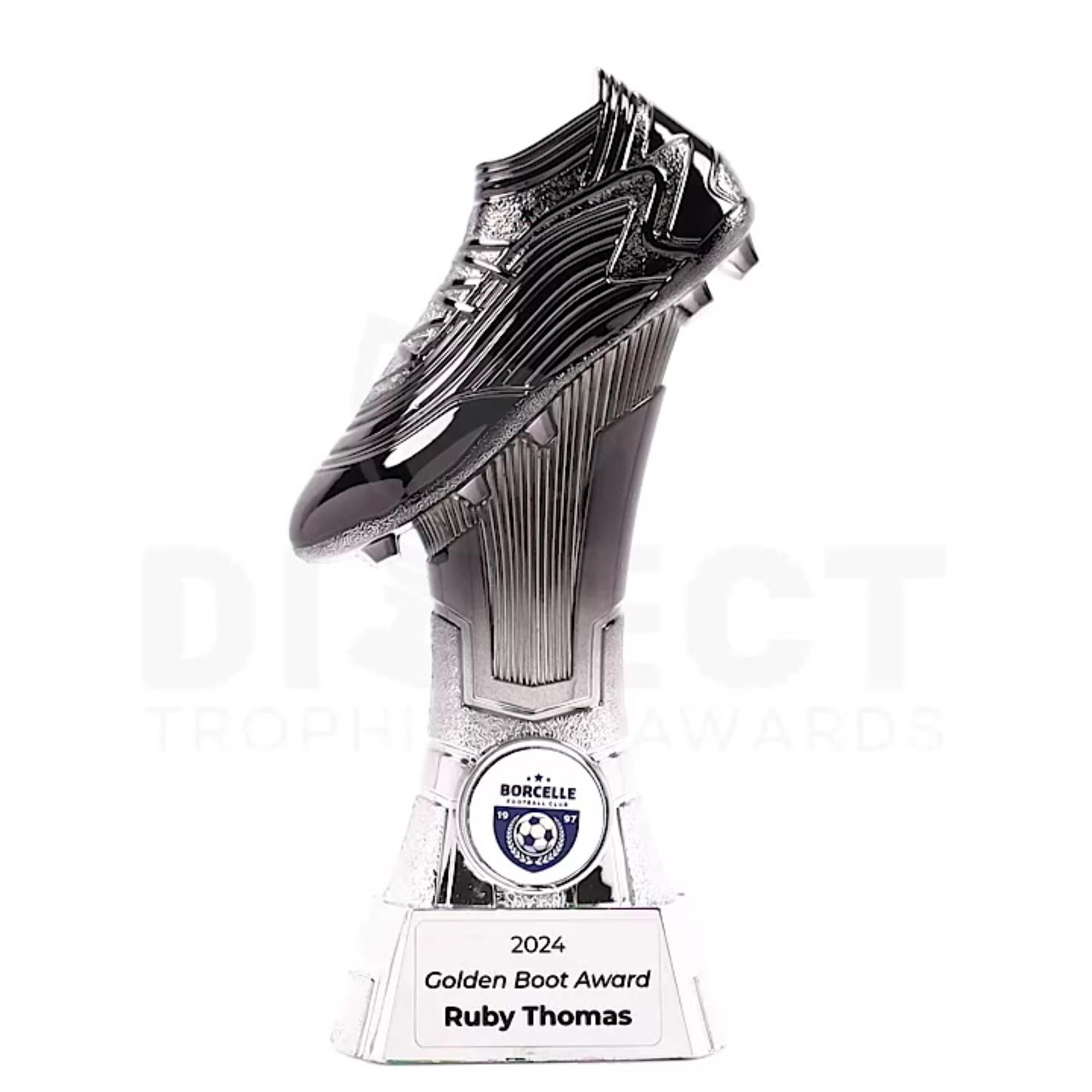 Faststriker Series Trophy: Celebrate high achievers with the Faststriker Series Trophy, featuring a striking boot design with a metallic silver-to-black fade. Perfect for special awards, it includes space for your custom image and complimentary laser engraving.