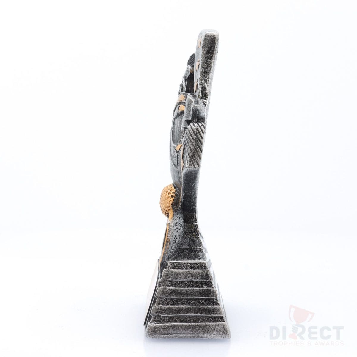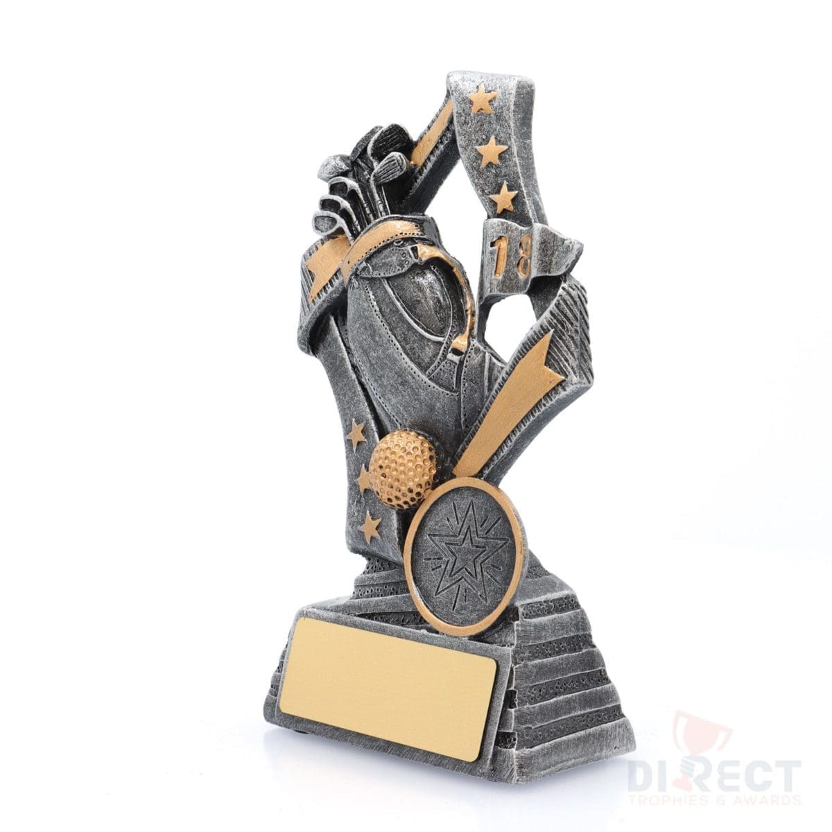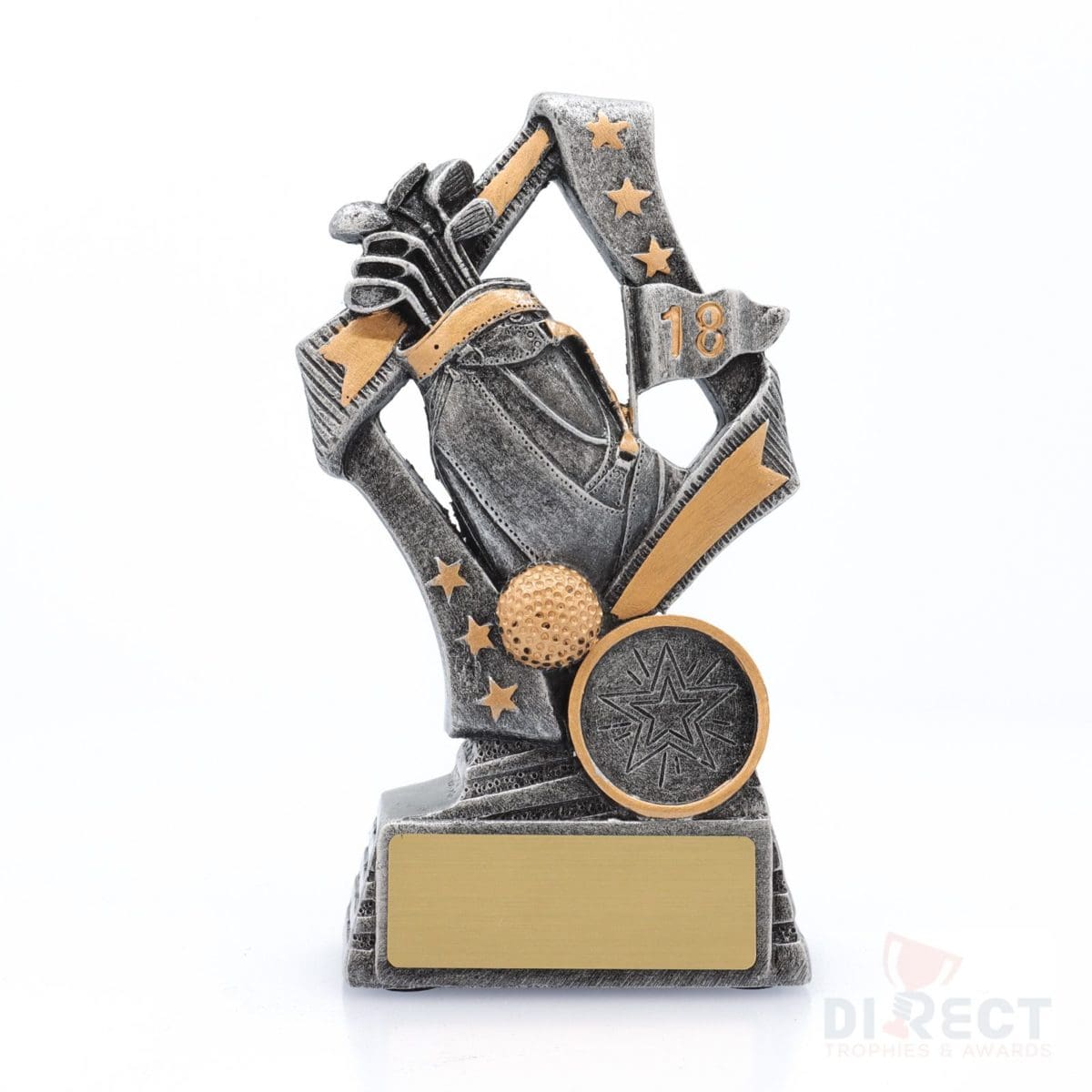 Dynamic golf trophies perfect for male and female golfers at your event. These ‘Flag’ golf trophies feature a stylish star based design with iconic golf bag and ball elements.