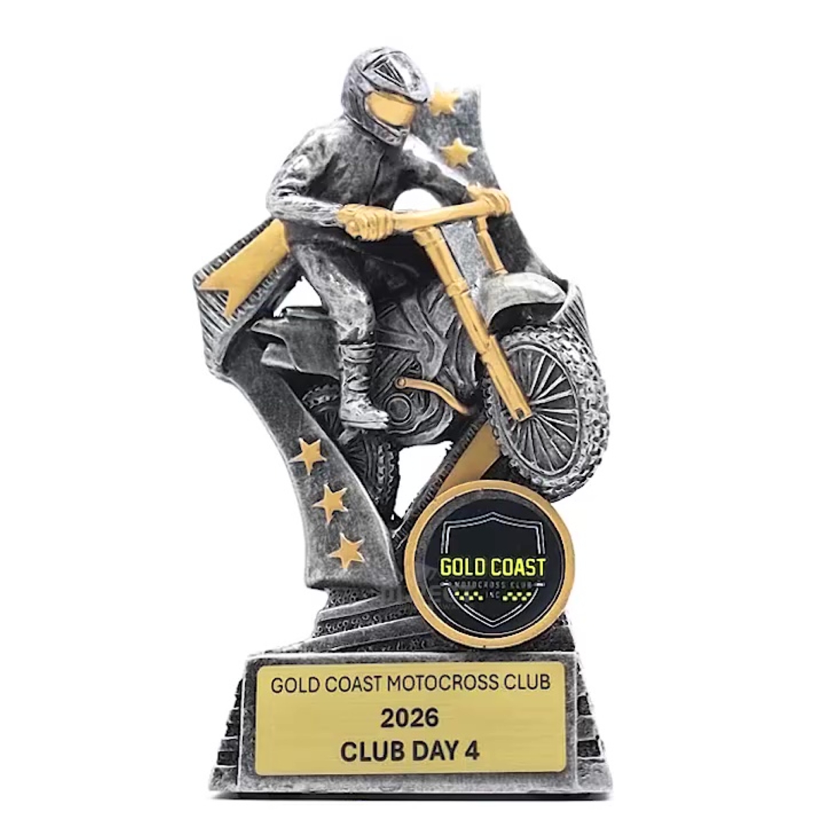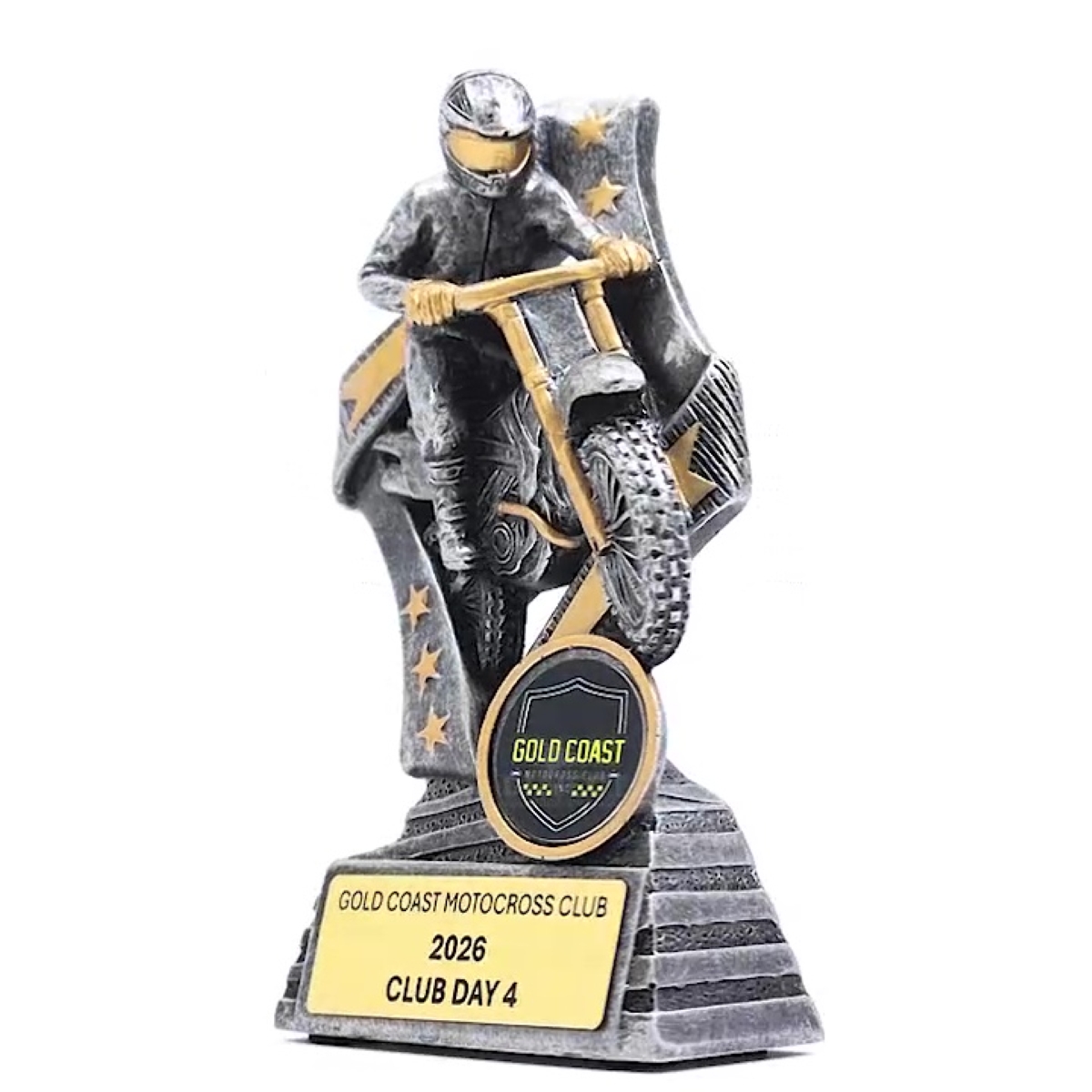 Dynamic motorcross trophies well suited to range of events. These ‘Flag’ bike trophies feature a stylish star based design with a rider in action.