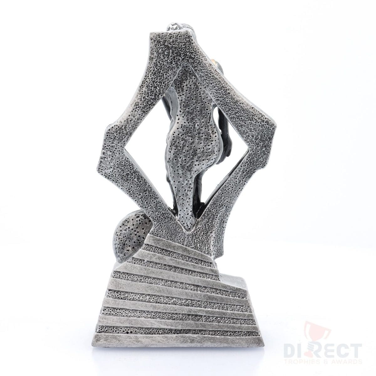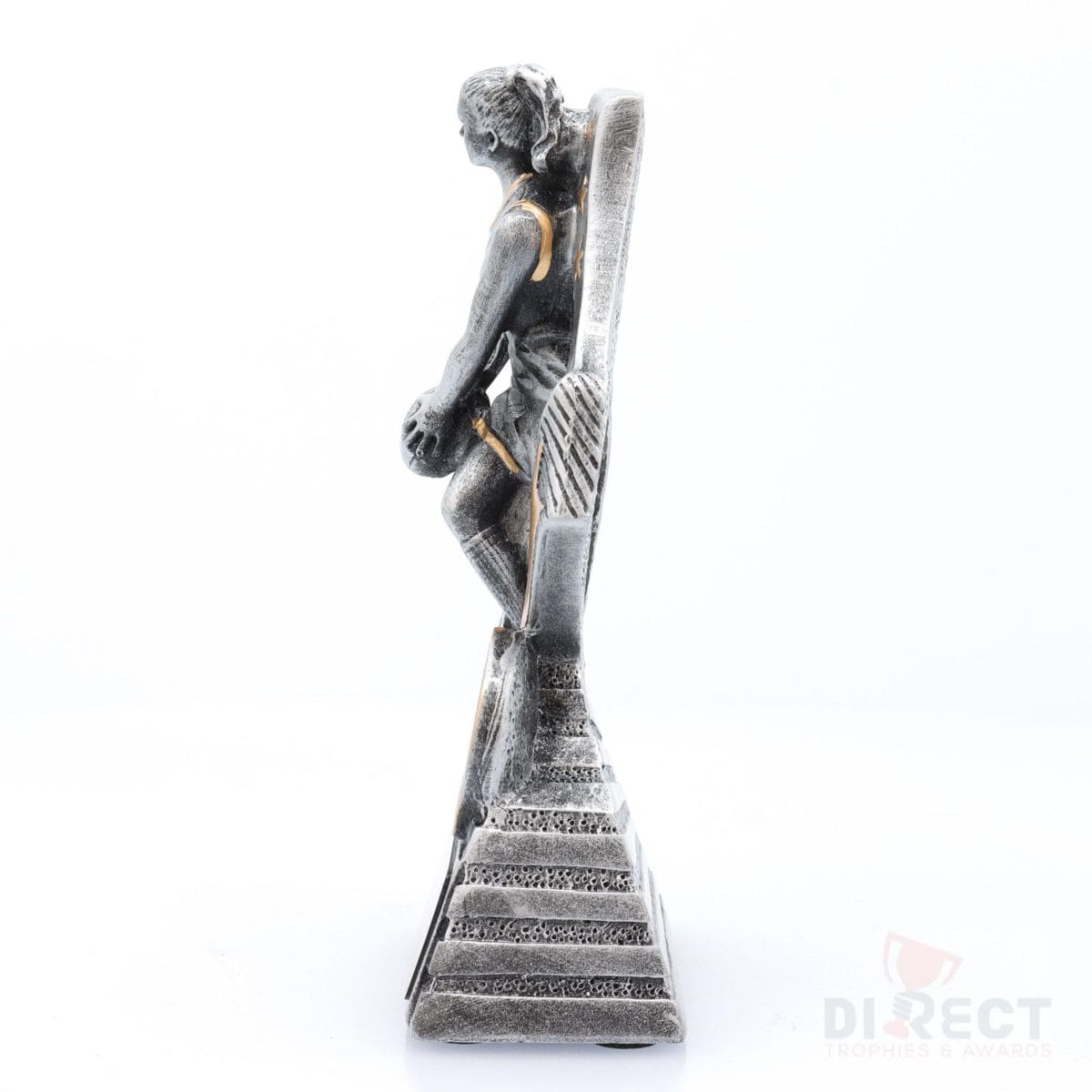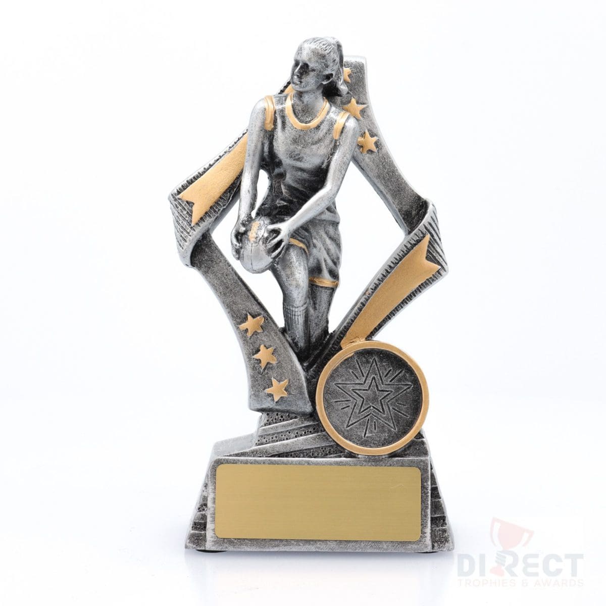 Dynamic footy trophies feature female player in action framed by a stylish star inspired design. Aussie rules trophies are finished in classic antique silver and gold. Perfect for various best player award categories.
