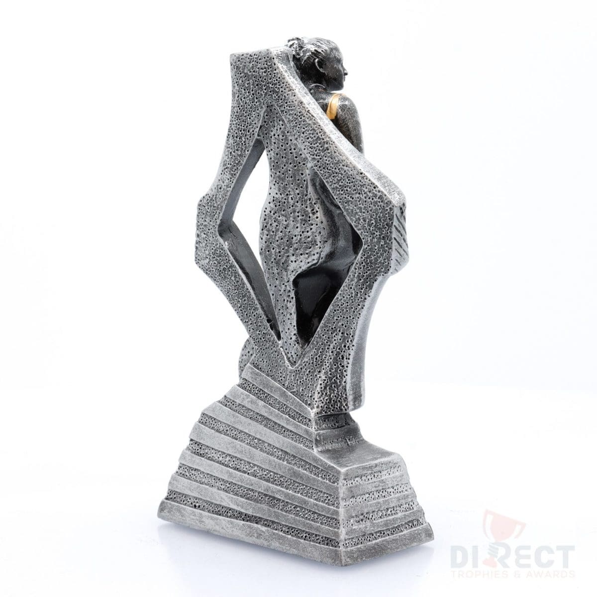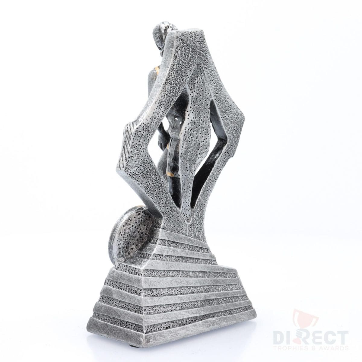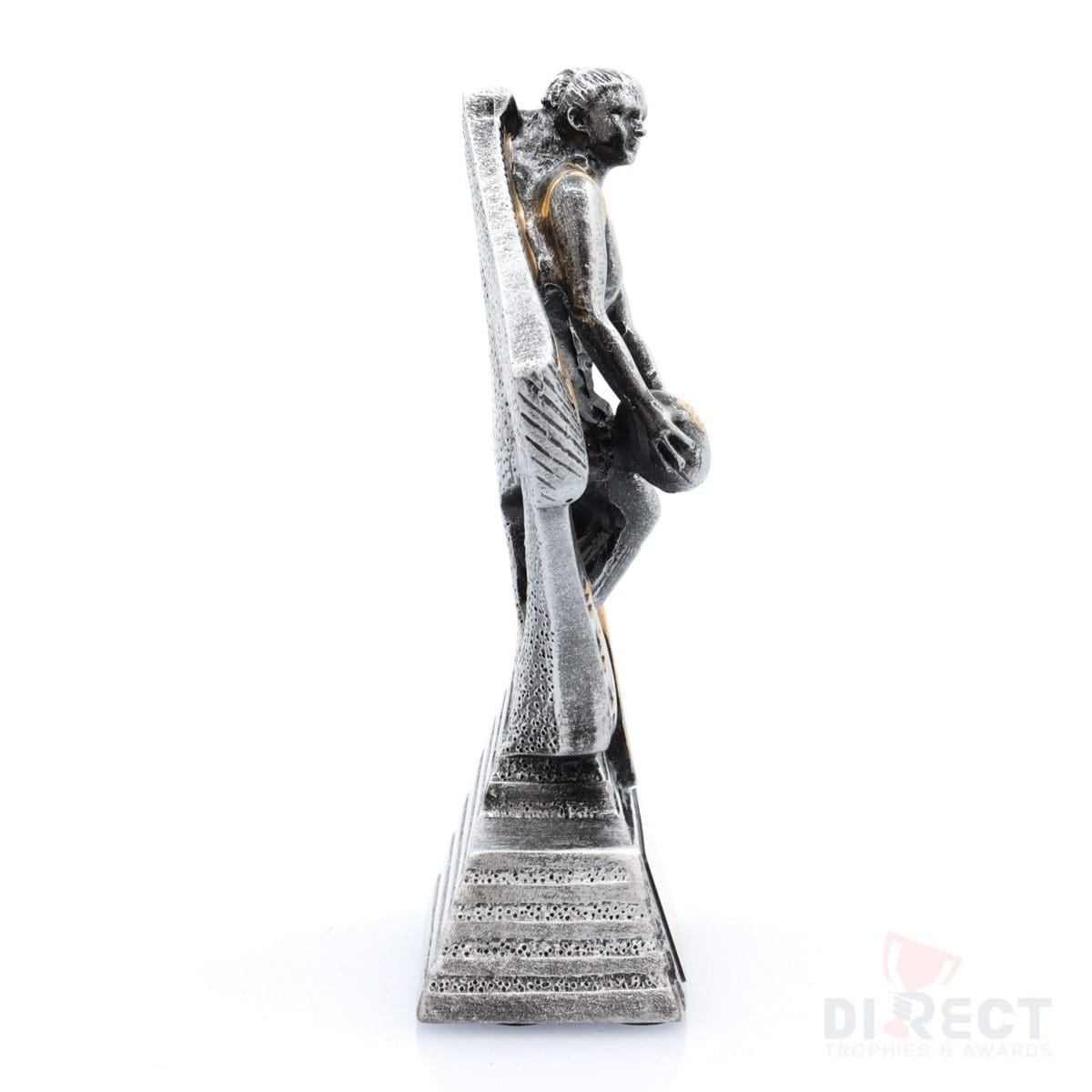 Dynamic footy trophies feature female player in action framed by a stylish star inspired design. Aussie rules trophies are finished in classic antique silver and gold. Perfect for various best player award categories.