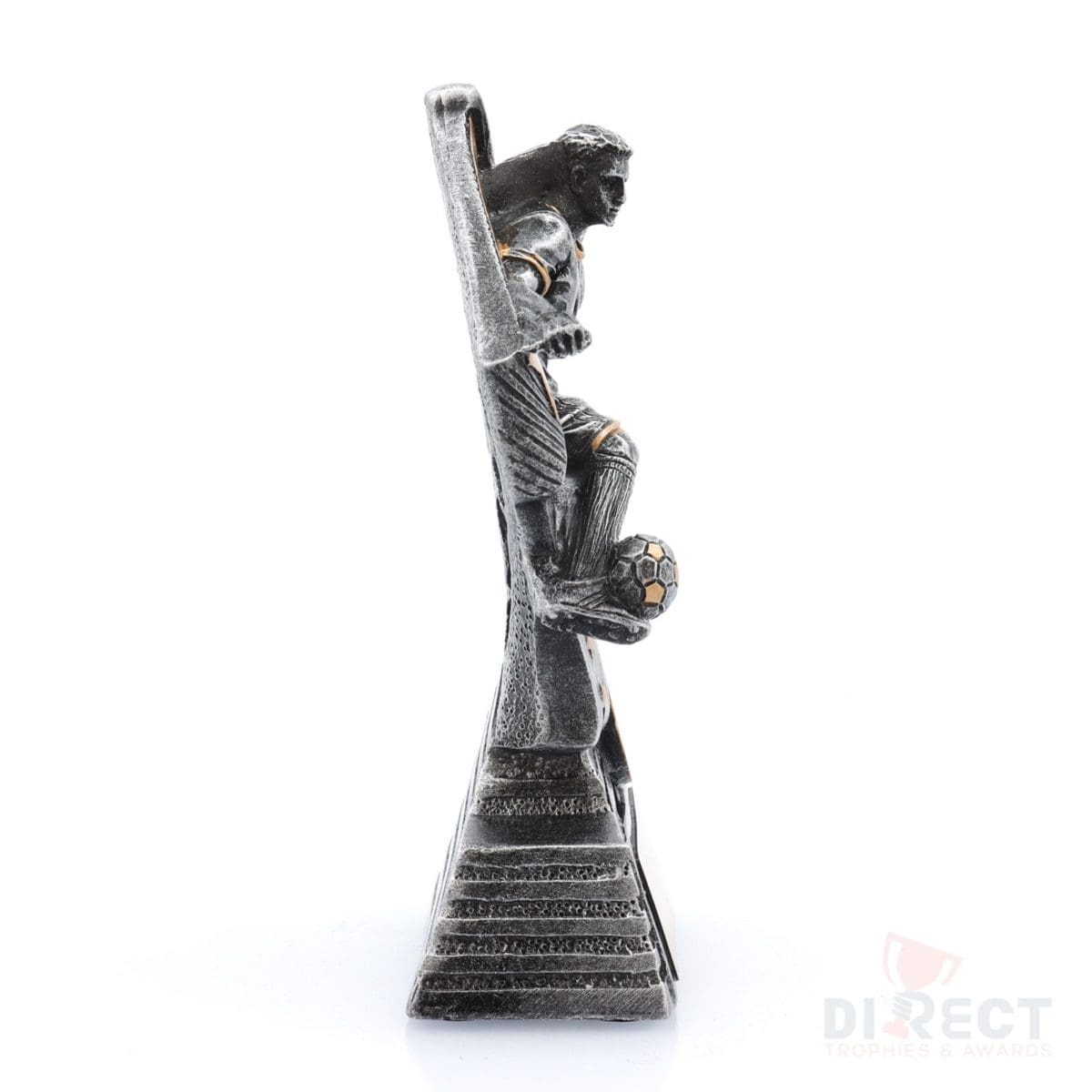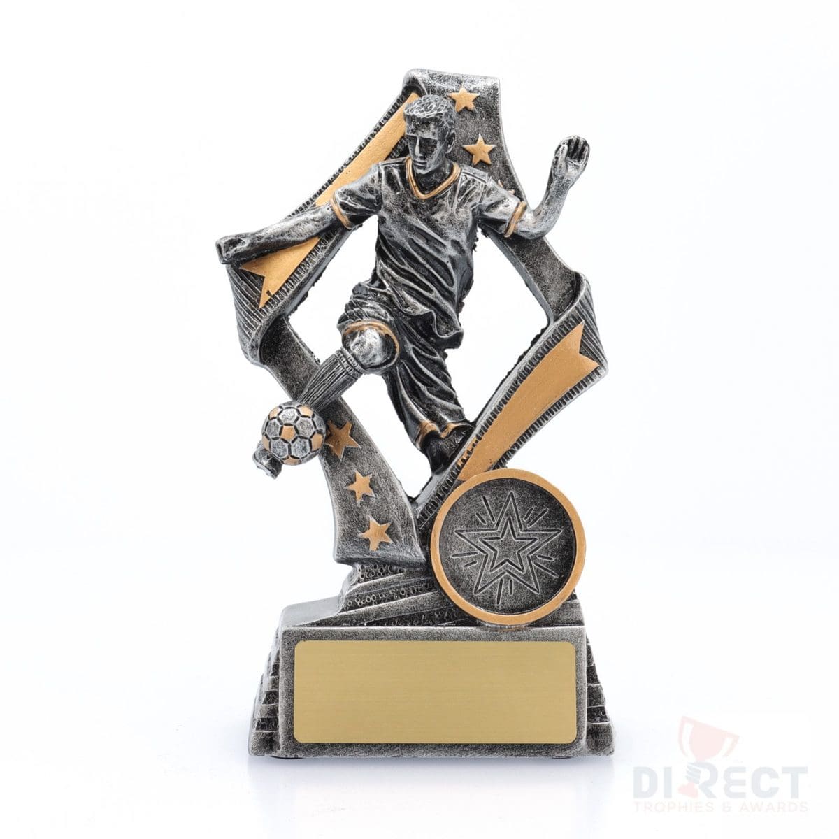 Dynamic football trophies feature female player in action framed by a stylish star inspired design. These special football trophies are finished in classic antique silver and gold. Perfect for various best player award categories.