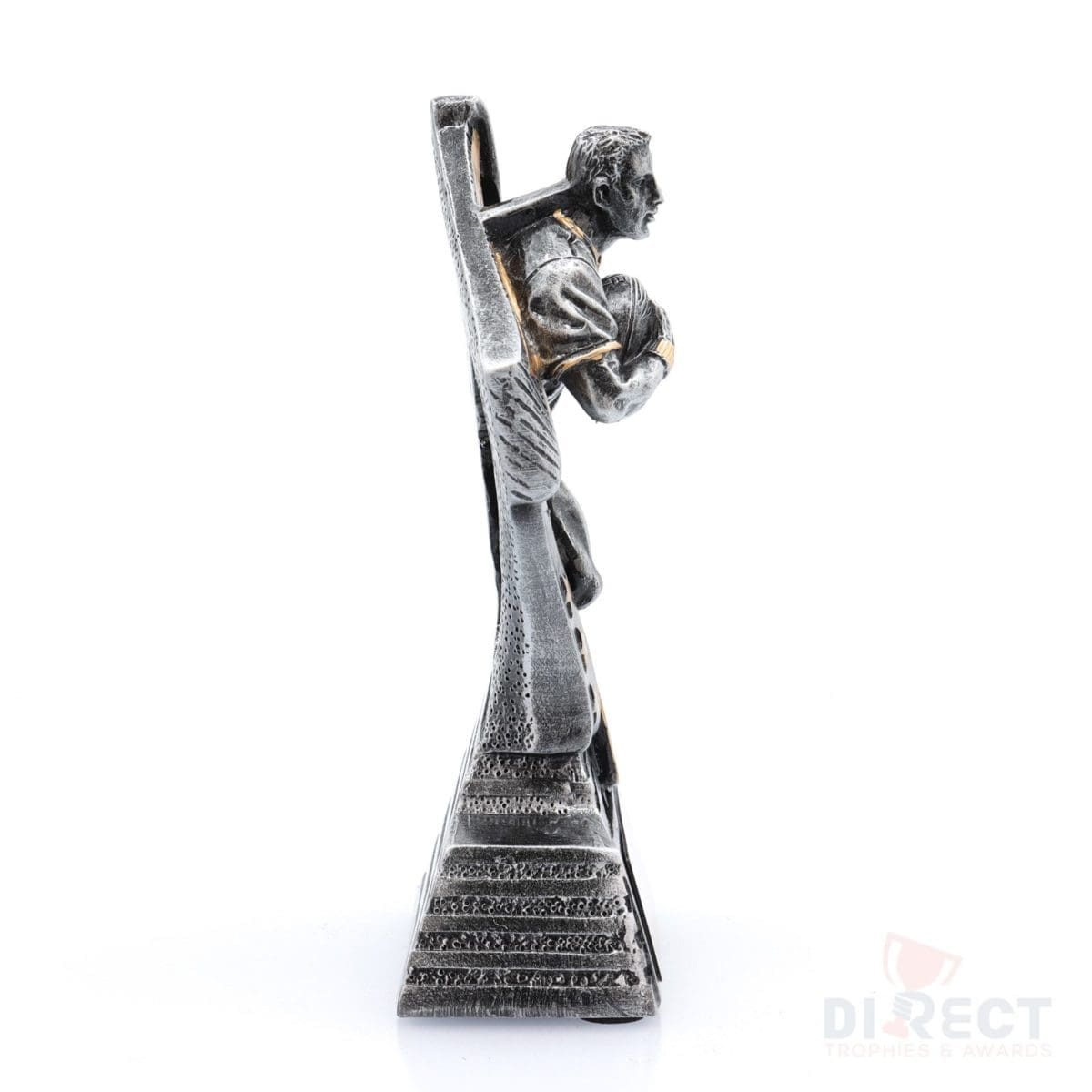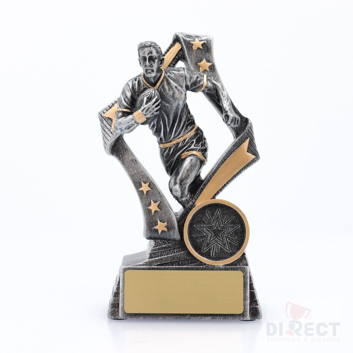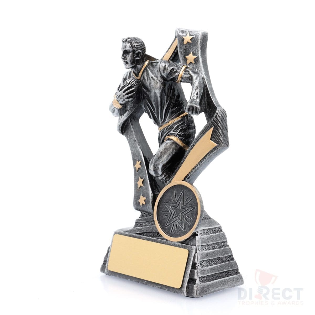Dynamic rugby trophies feature male player in action framed by a stylish star inspired design and finished in classic antique silver and gold. Perfect for both league and union and for various award categories.