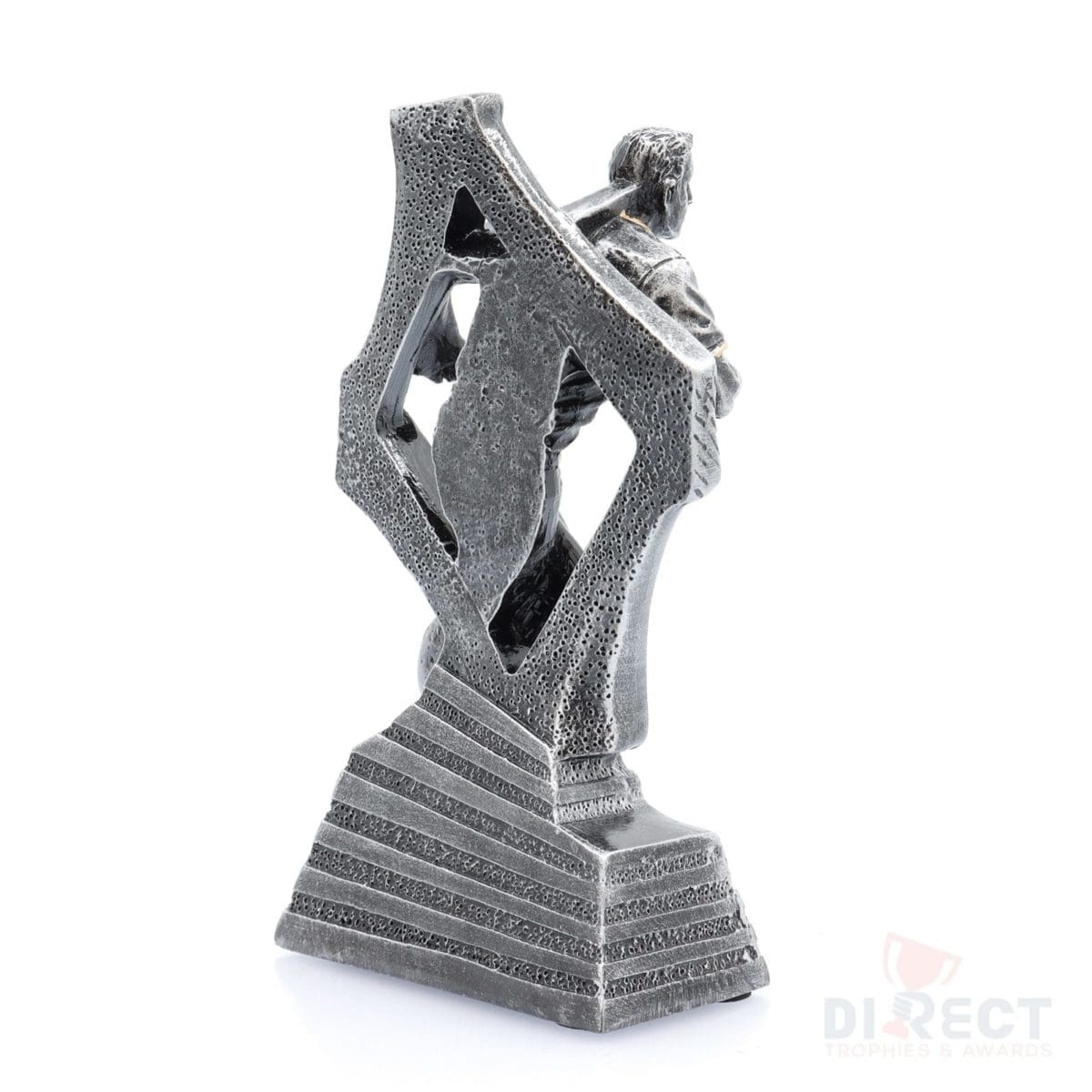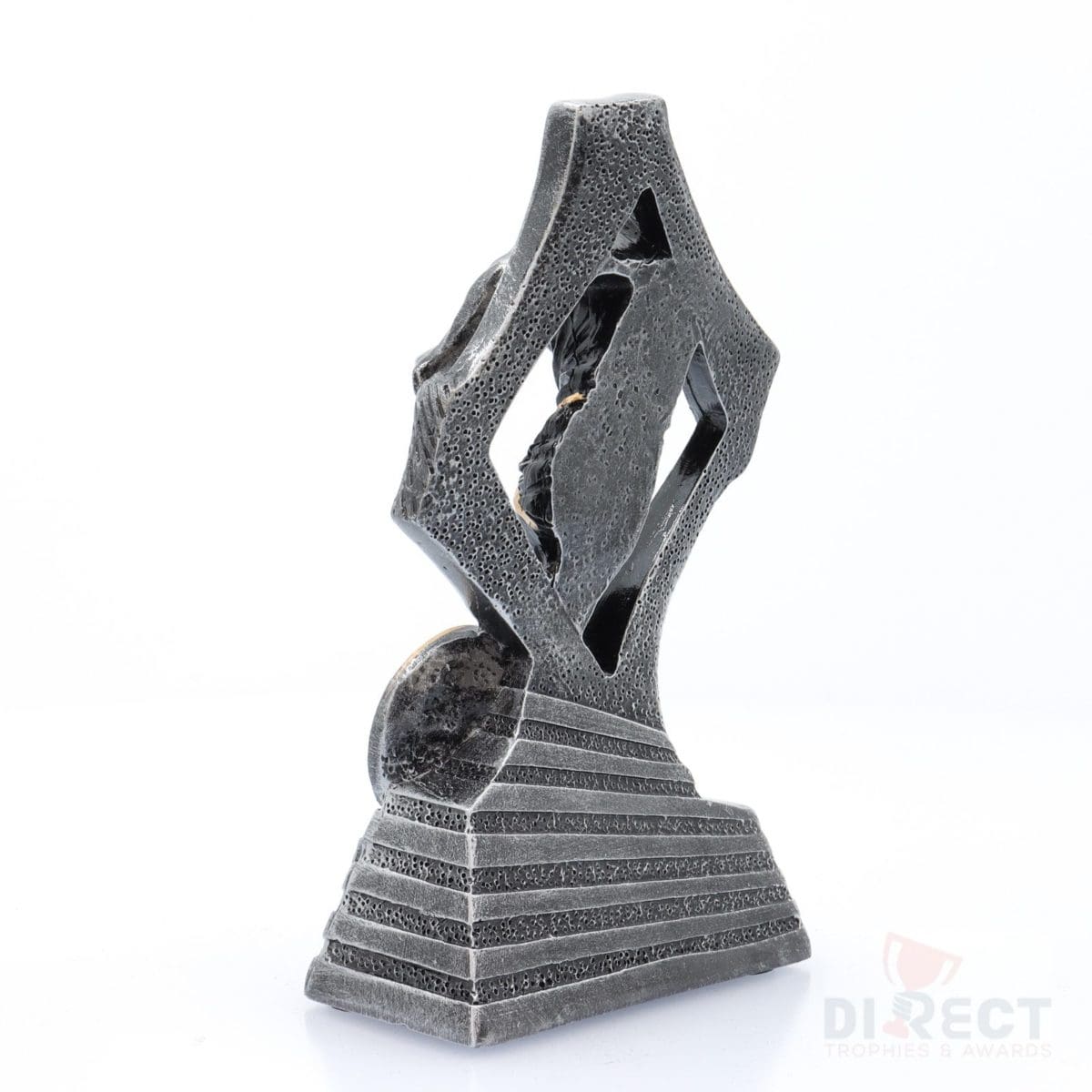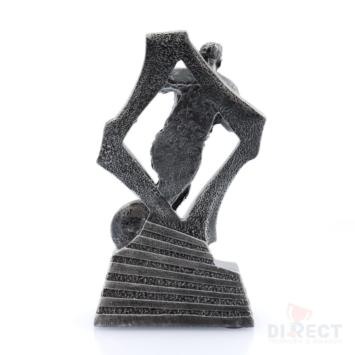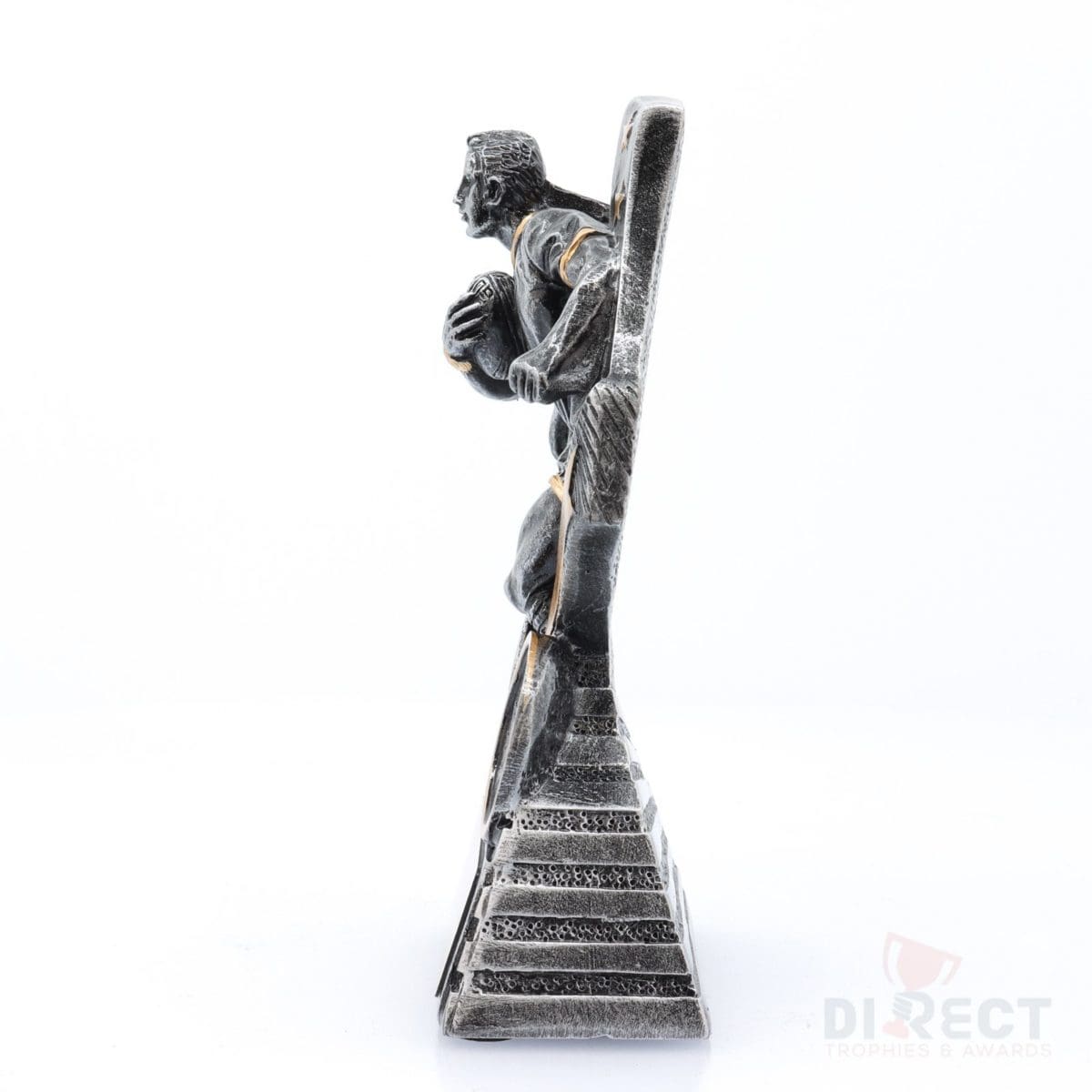 Dynamic rugby trophies feature male player in action framed by a stylish star inspired design and finished in classic antique silver and gold. Perfect for both league and union and for various award categories.