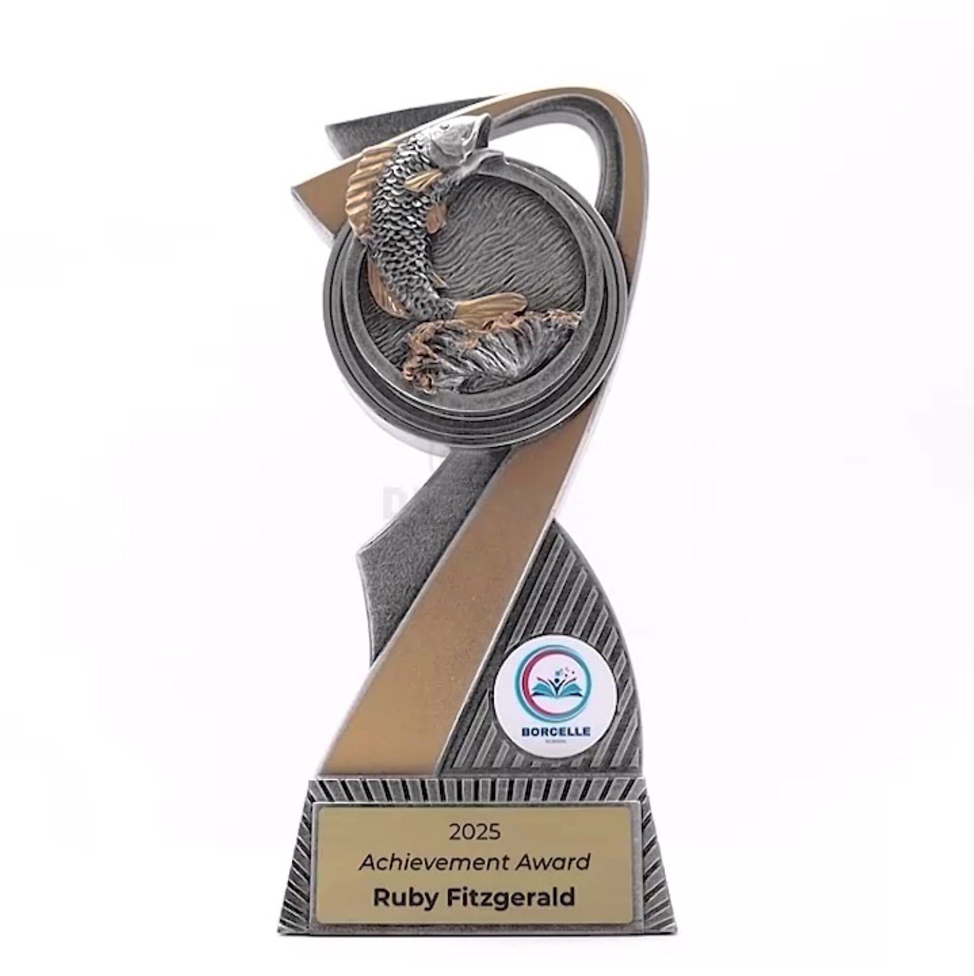 Flarex Trophy Series: Sleek arc-shaped resin trophies, perfect for various sports and events. Available in multiple sizes, with space for a custom image and complimentary laser engraving.