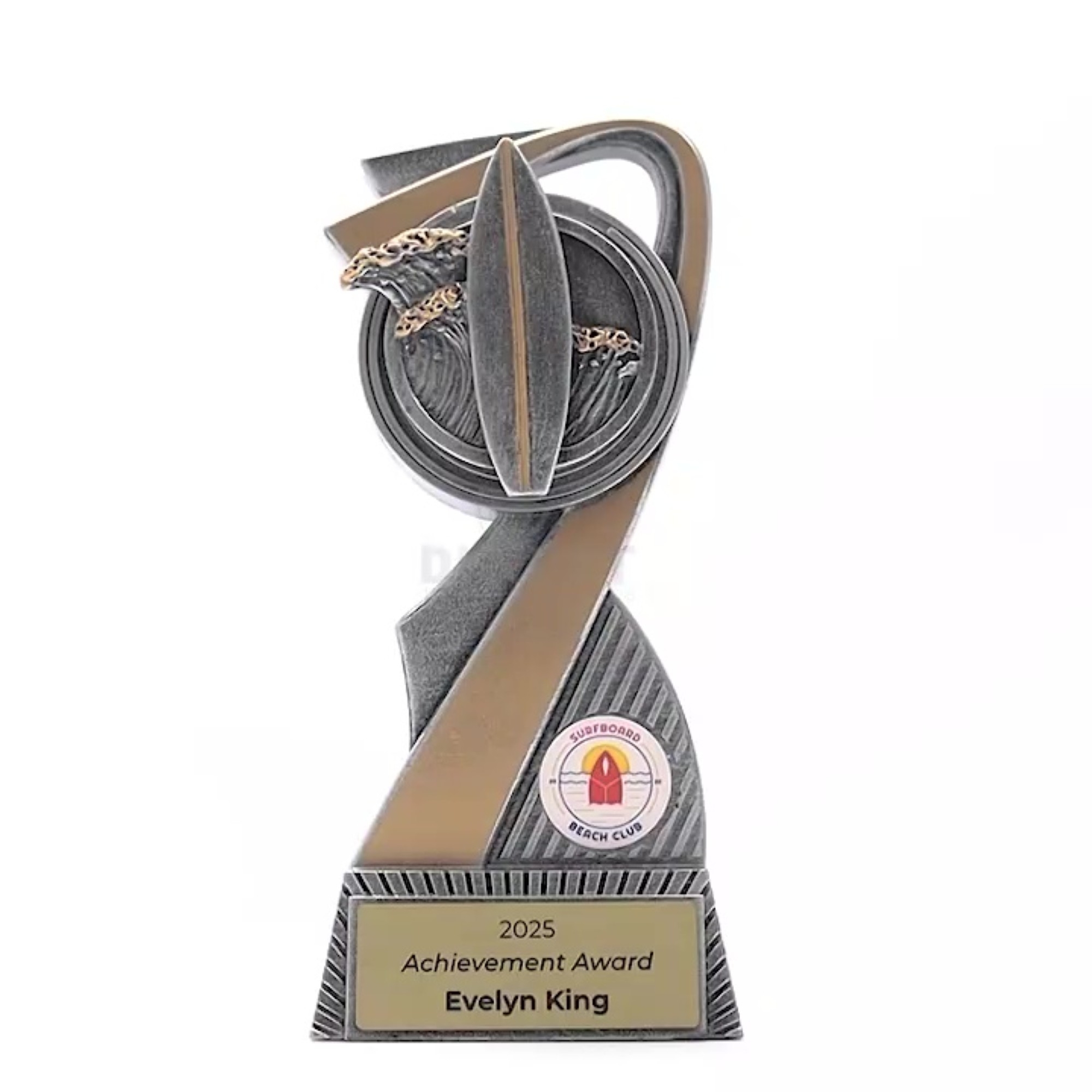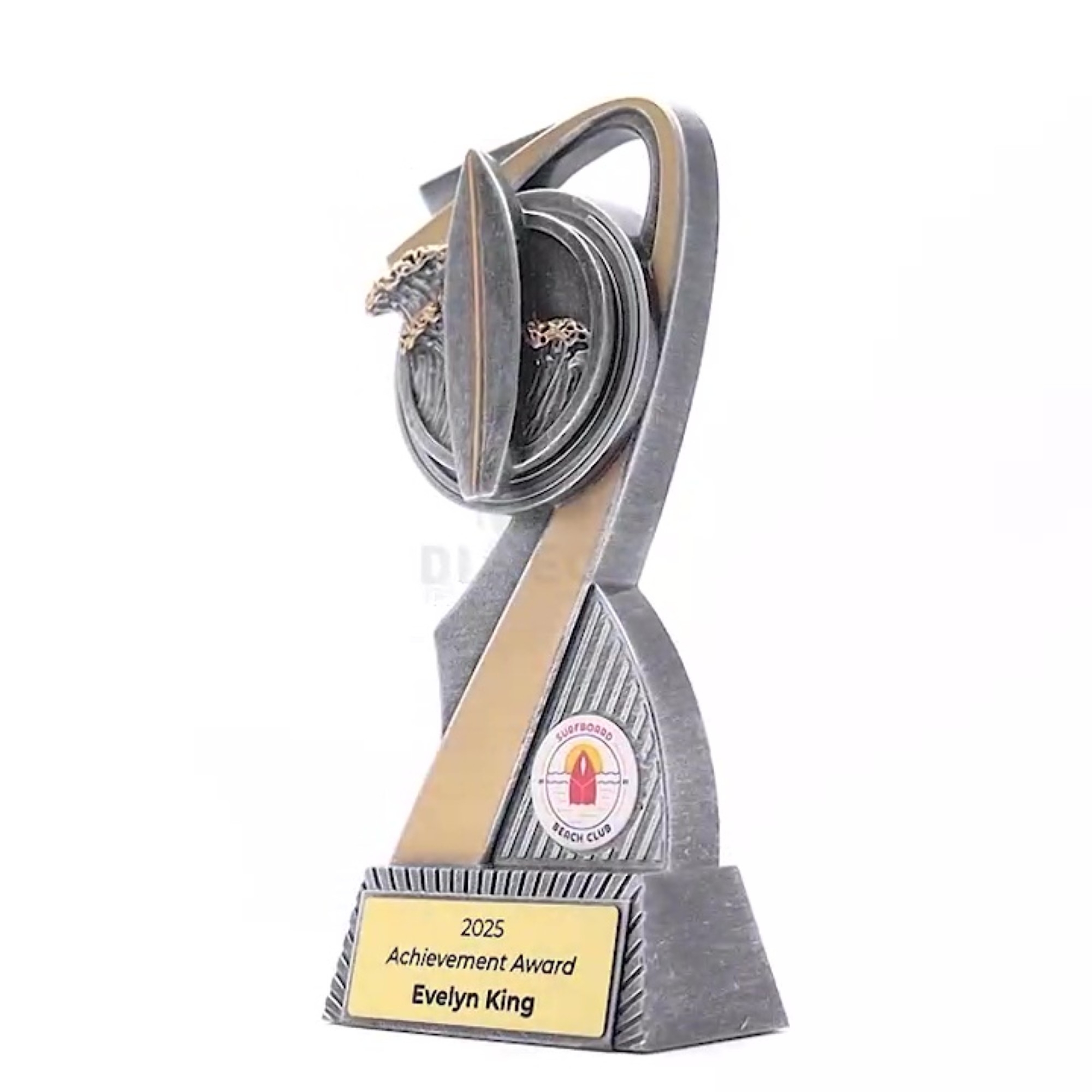 Flarex Trophy Series: Sleek arc-shaped resin trophies, perfect for various sports and events. Available in multiple sizes, with space for a custom image and complimentary laser engraving.