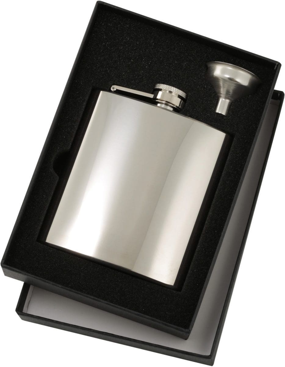 Stainless Steel Flask 6 oz. in a gift set with pourer and presentation gift box with transparent cover. Polished matt finish. An excellent award or gift idea for your business or sporting club.