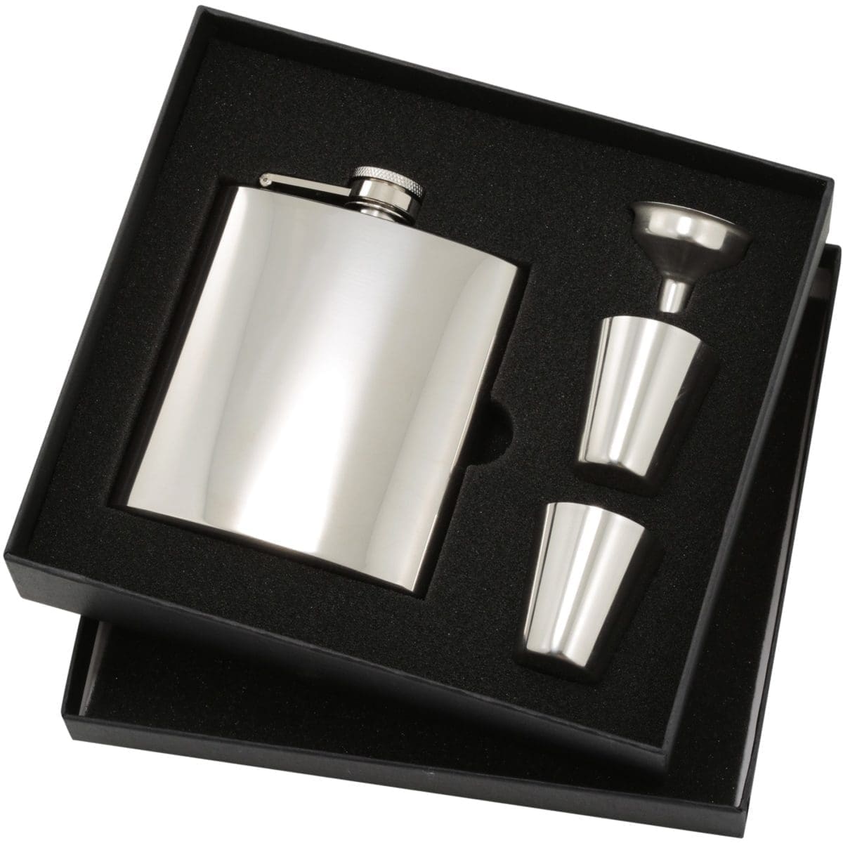 Stainless Steel Flask 6 oz. in a gift set with pourer, two mini cups and presentation gift box. Polished matt finish. An excellent award or gift idea for your business or sporting club.