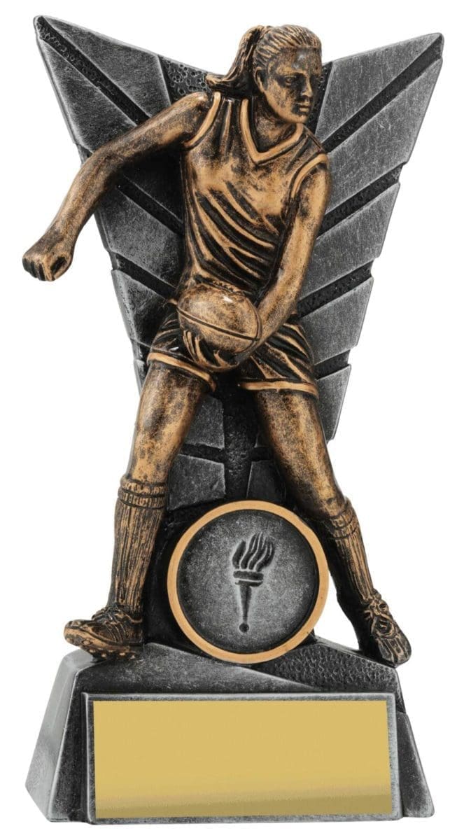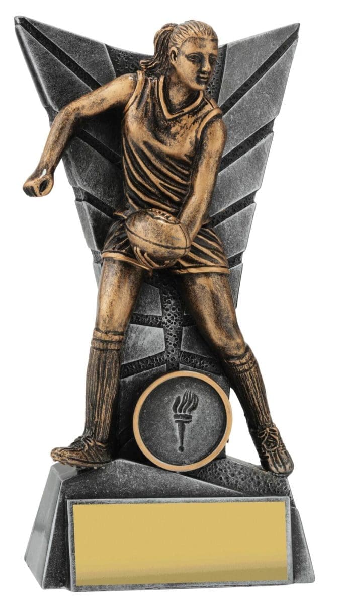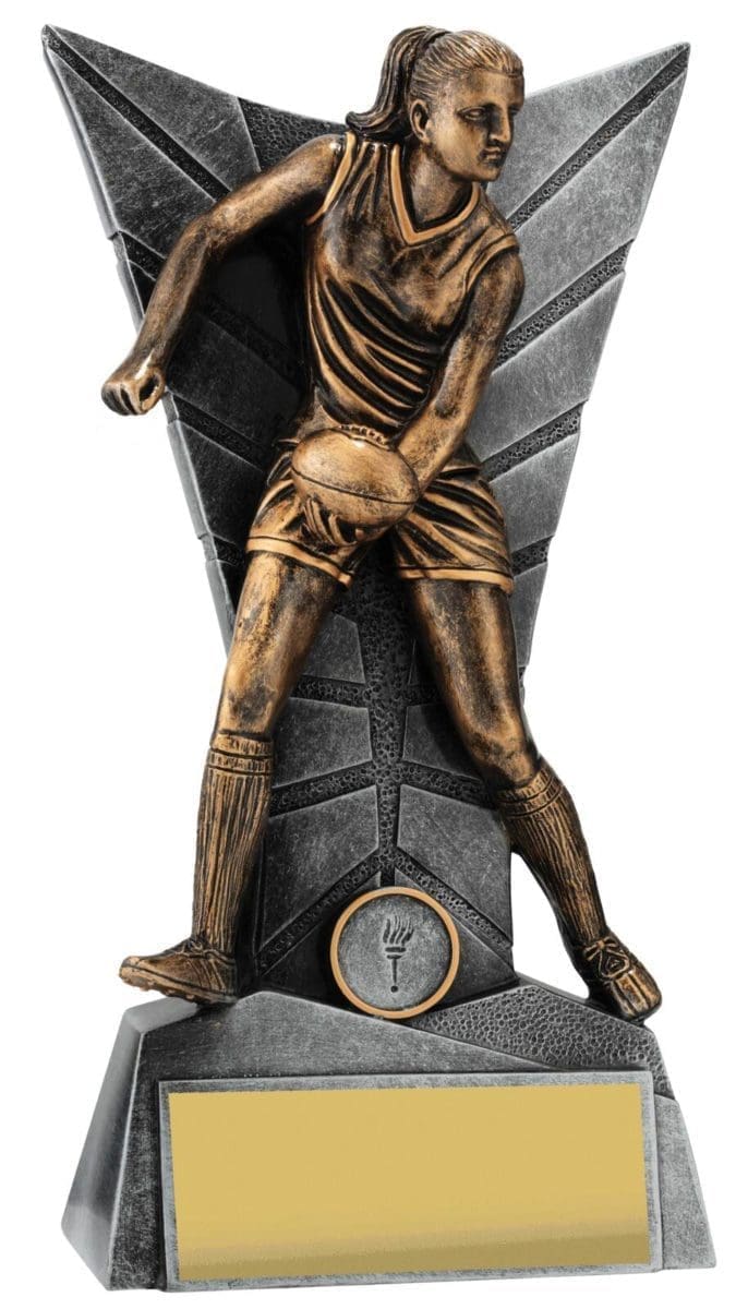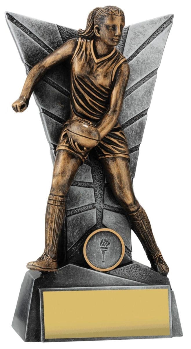 Elegant silver backdrop for this trophy series frames the detailed player captured in action. Footy trophies available in male and female and in multiple sizes to suit your award needs. Excellent choice for best player trophies for your team or club.