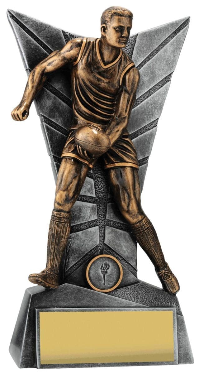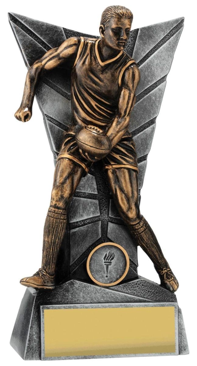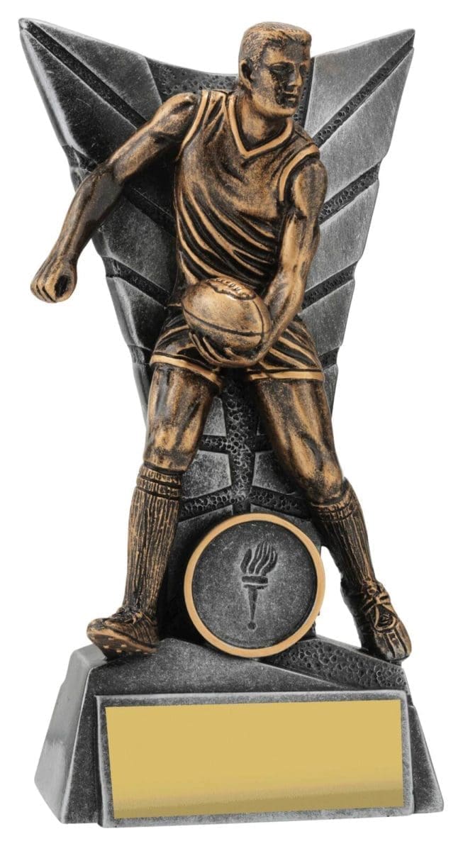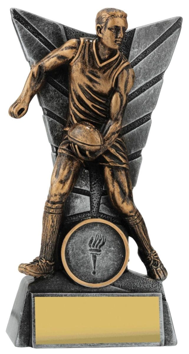 Elegant silver backdrop for this trophy series frames the detailed player captured in action. Footy trophies available in male and female and in multiple sizes to suit your award needs. Excellent choice for best player trophies for your team or club.