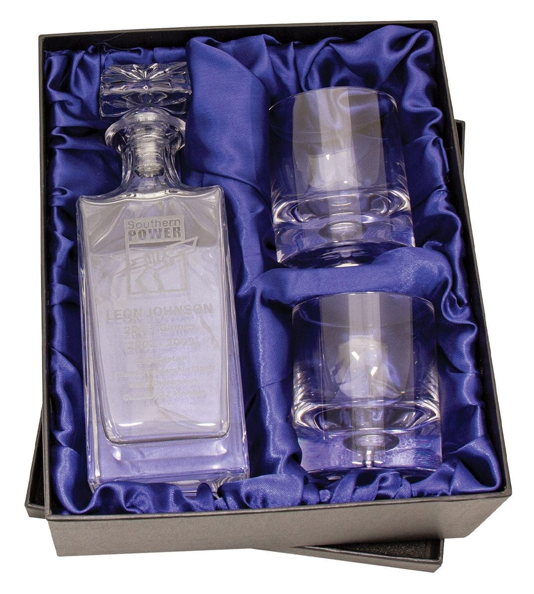 Gift box for space for decanter and two whisky glasses. Glassware sold separately. Makes an excellent gift or award idea for that special recipient.