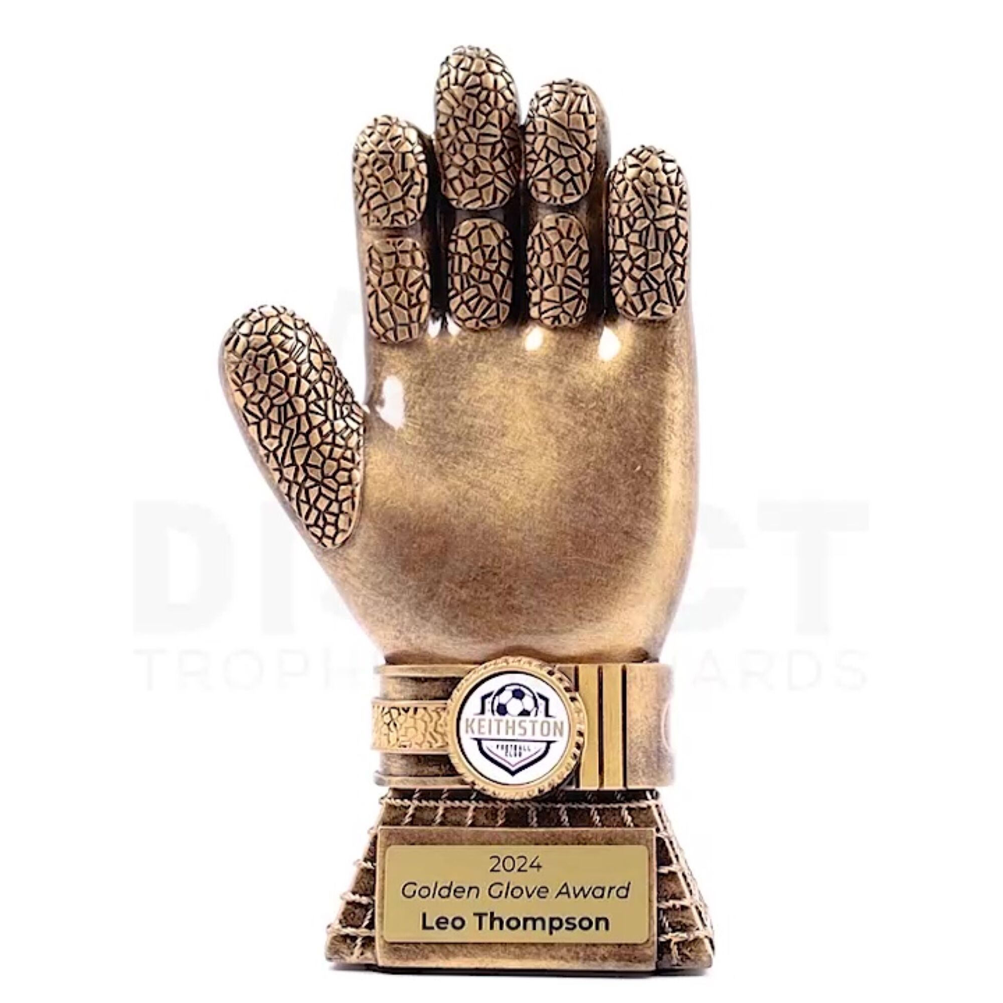 Golden Glove Football Trophy: Recognise exceptional goalkeeping with the Golden Glove Football Trophy, featuring an antique gold finish. Perfect for special awards, it includes space for custom images and complimentary laser engraving.