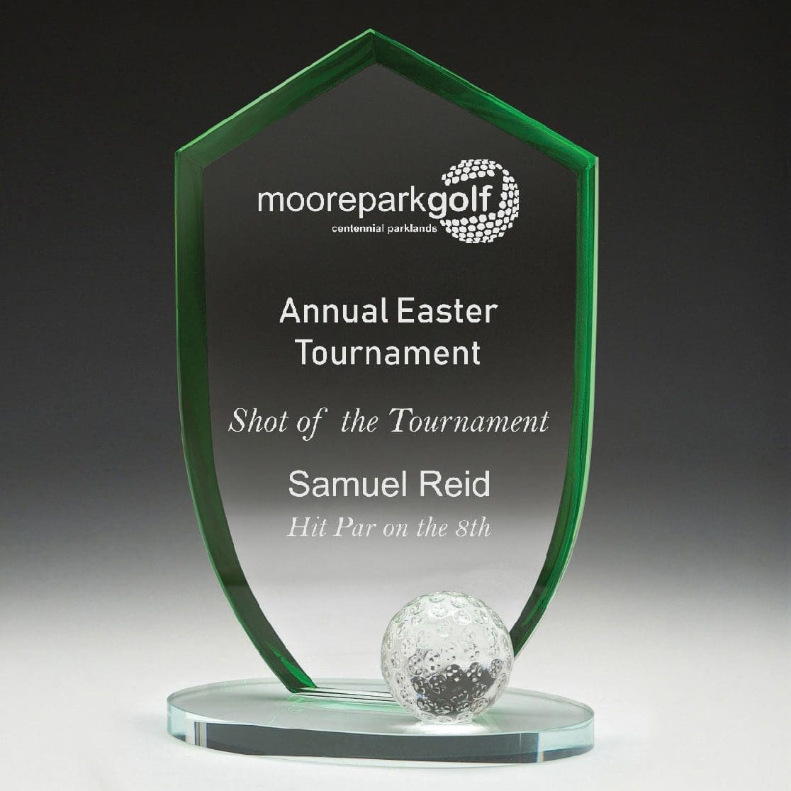 Glass awards offer distinctive shape & colour over 3 sizes sure to stand out at your event or presentation. Supplied in gift box.