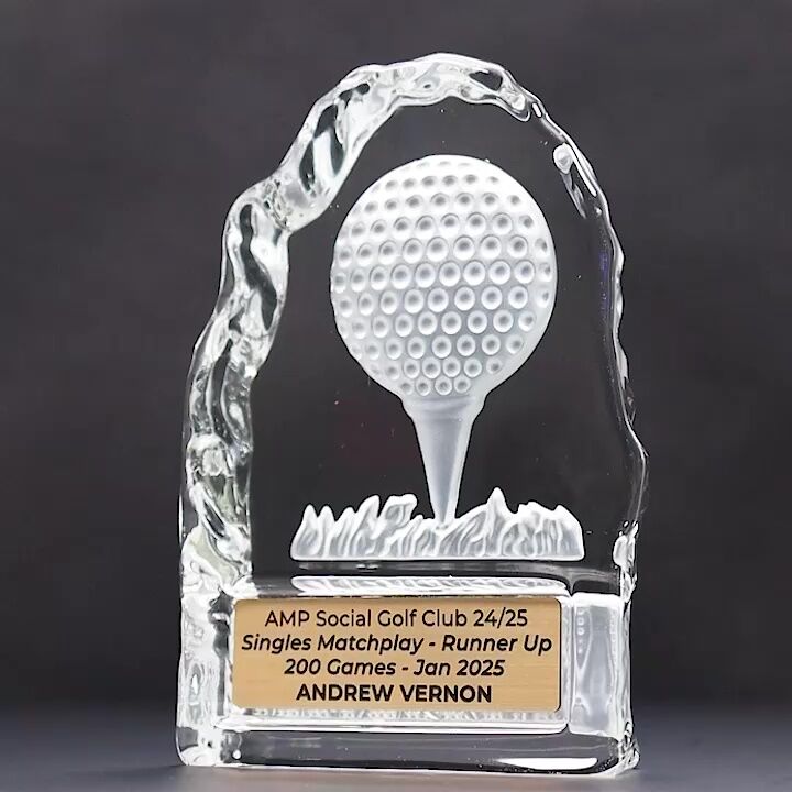 Affordable crystal iceberg award design features a detailed golf ball on tee design. A versatile trophy suitable for a range of golf event awards, with space for your engraving and available in a presentation gift box.