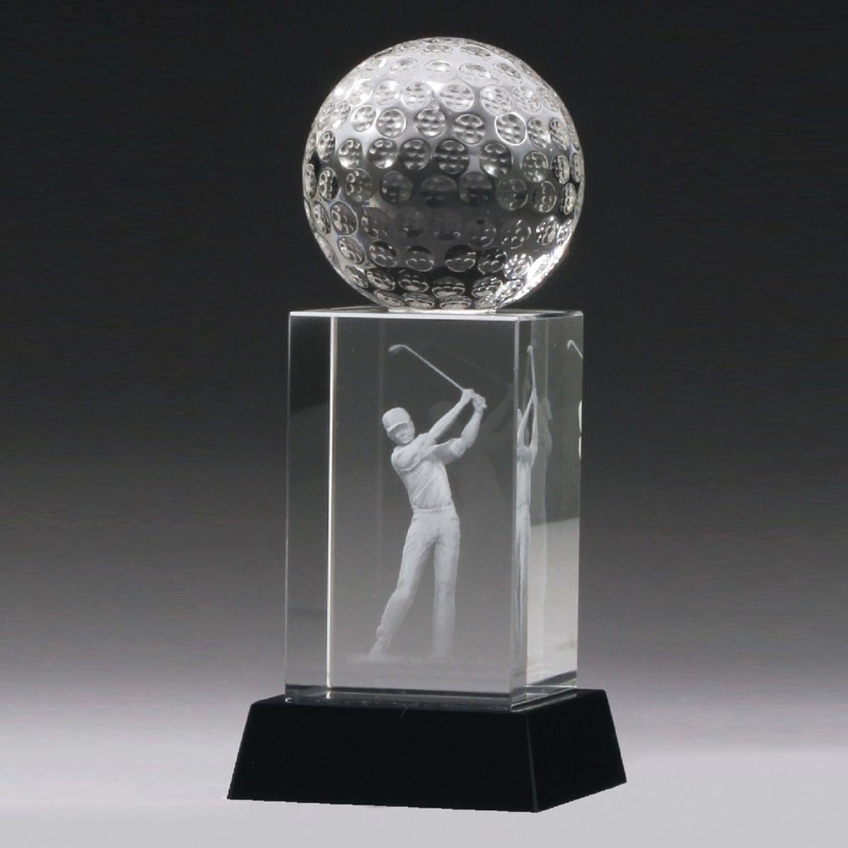 Prestige golf trophy award suitable for various golfing events and competitions. The design features a precise 3D golf hologram, classic black base and detailed crystal golf ball.