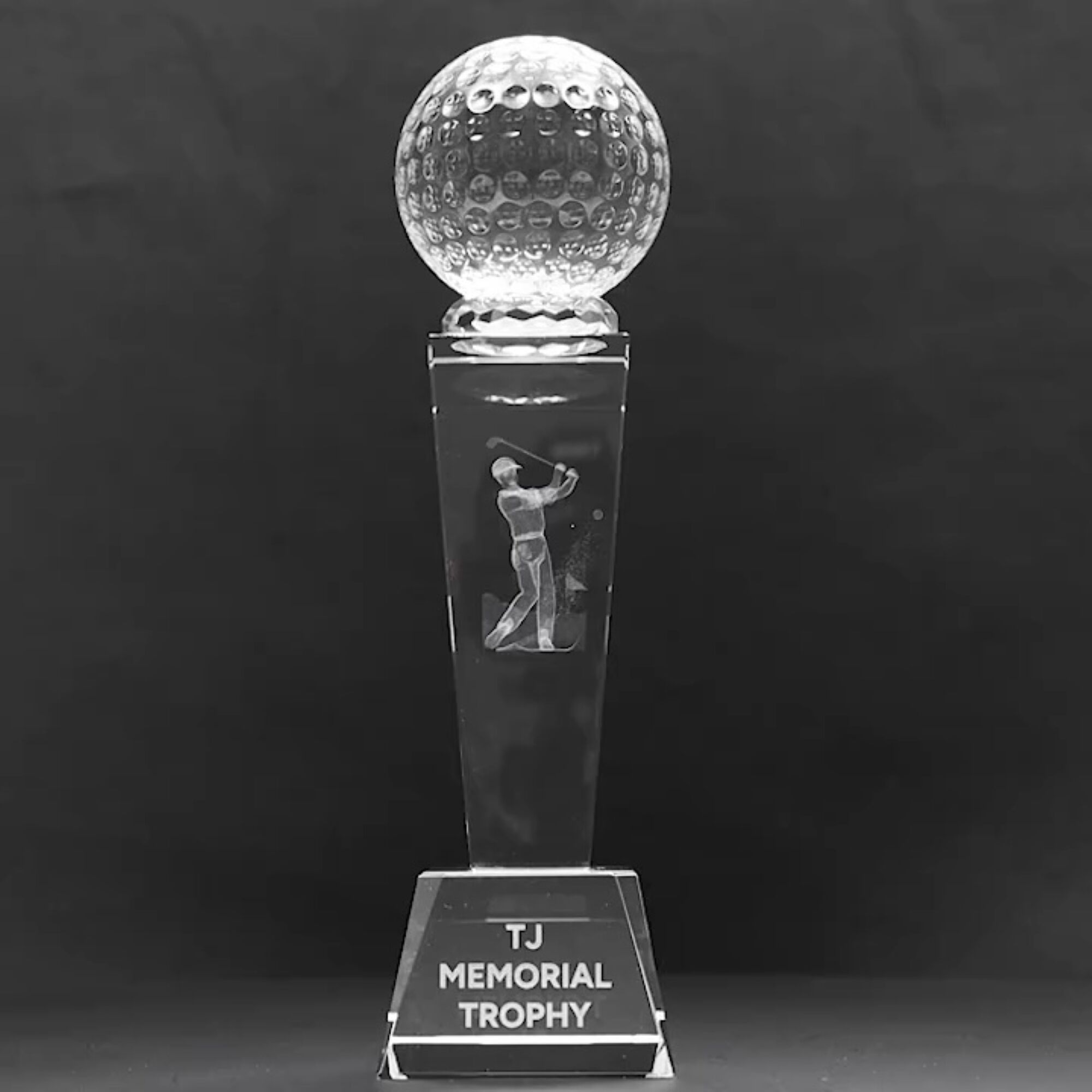Brilliant golf crystal award in 2 great sizes showcases a 3D crystal golf ball atop the elegant tower structure. The design features a precise golf scene hologram that elevates this prestige trophy series. In presentation gift box.