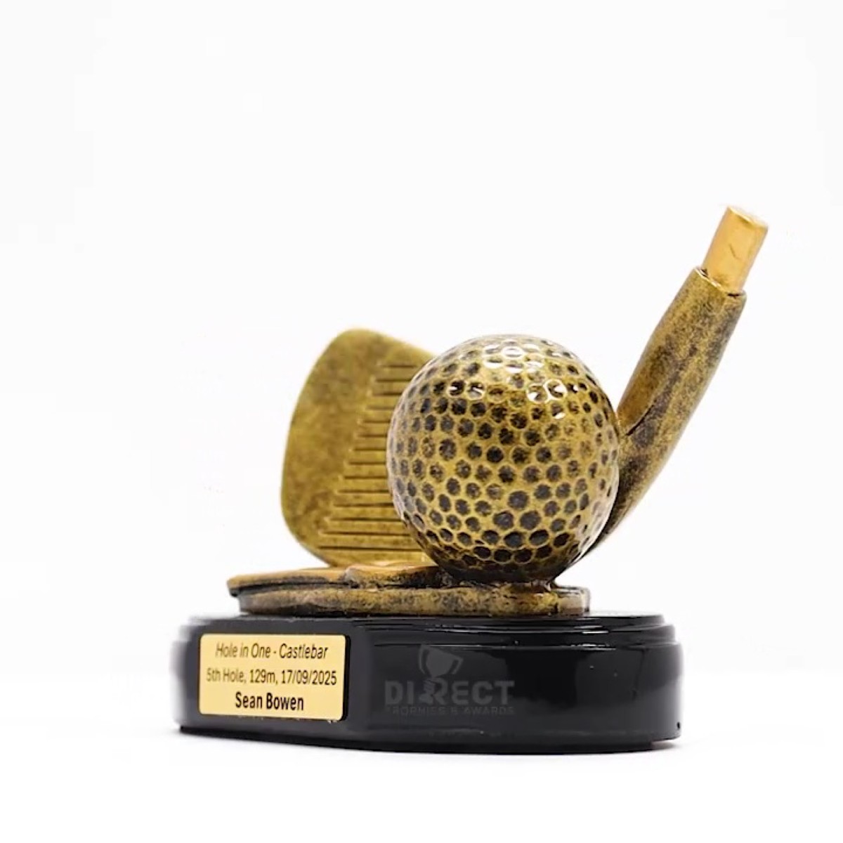 Introducing the Golf Mini Iron Trophy: This award is a popular choice, featuring a stunning antique gold finish and intricate details. It complements our Driver and Putter club trophy awards, allowing you to create a cohesive set. Plus, we offer free laser engraving to make it truly personalized.