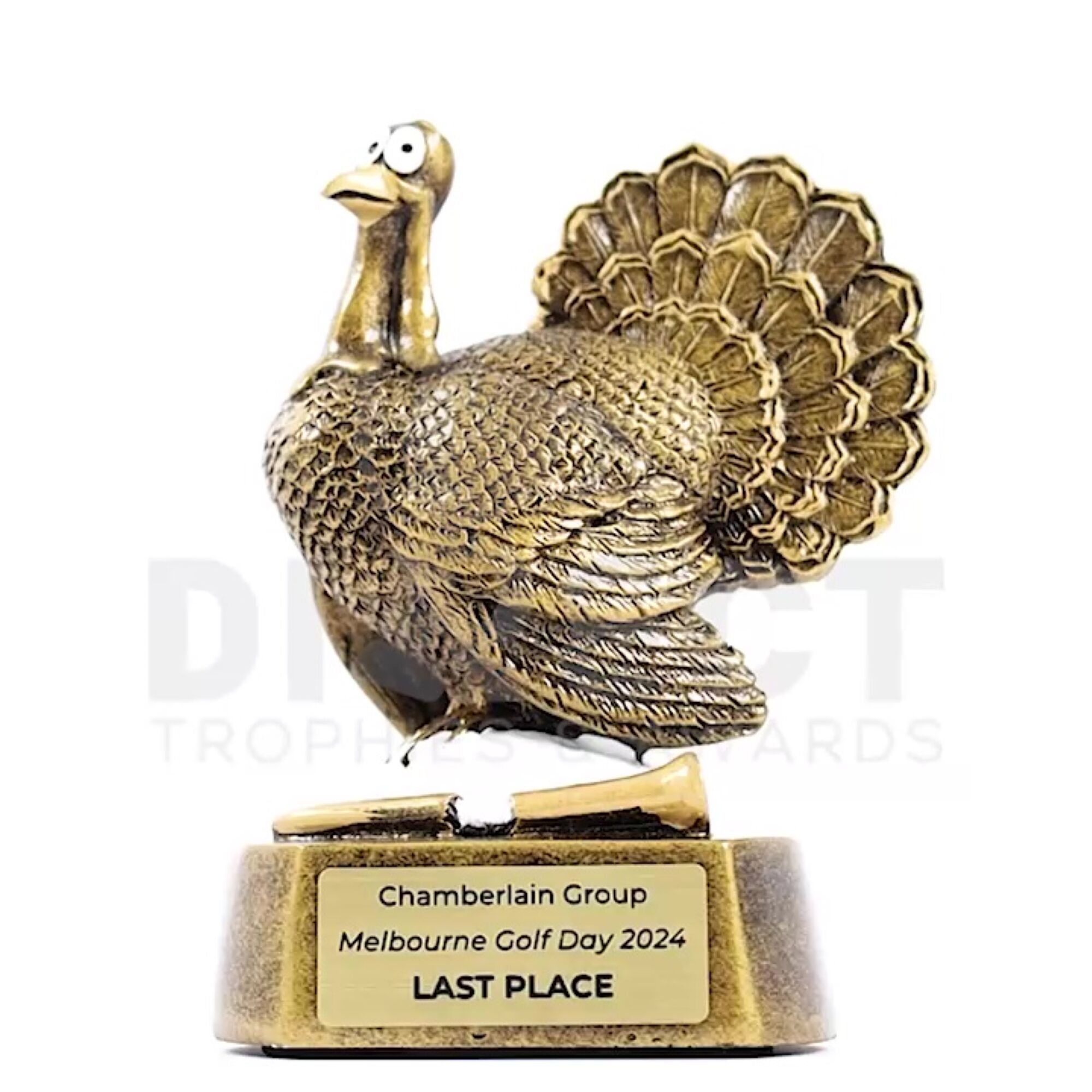 Novelty trophy finished in classic antique gold and with excellent detail and craftsmanship. The Turkey award can be used as part of your day or event award celebrations for that special performer.