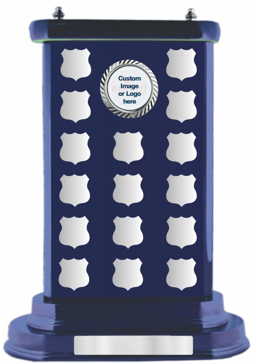 Grand perpetual finished in gloss royal blue finish. Metal Silver plates compliment the shiny finish. Space for a logo or custom image. Blank plates included as per setup shown. Title plate included in the price. Engraving on perpetual plates extra cost.