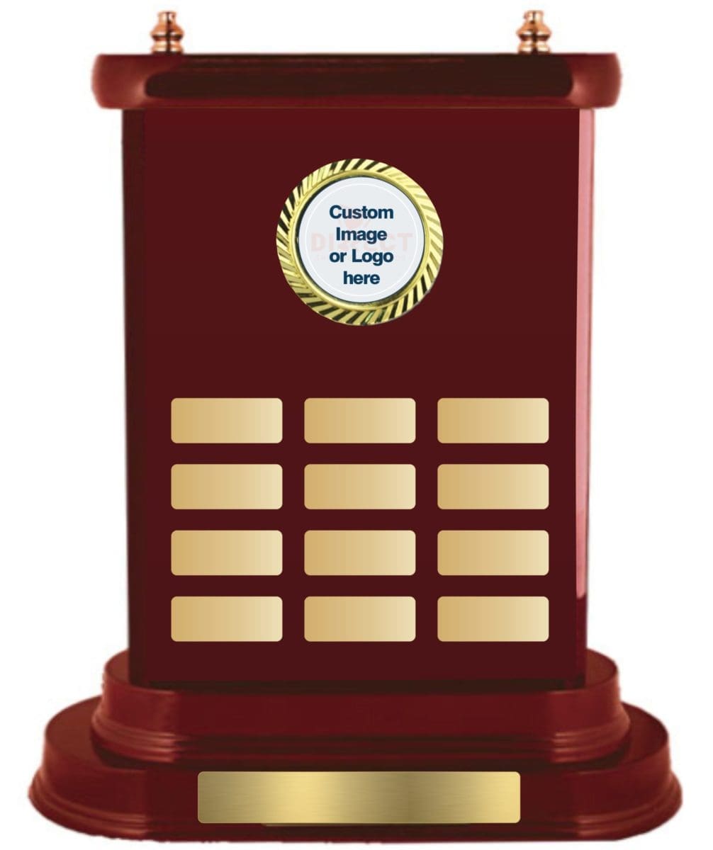 Grand perpetual finished in gloss woodgrain finish. Metal gold plates compliment the shiny finish. Space for a logo or custom image. Blank plates included as per setup shown. Title plate included in the price. Engraving on perpetual plates extra cost.