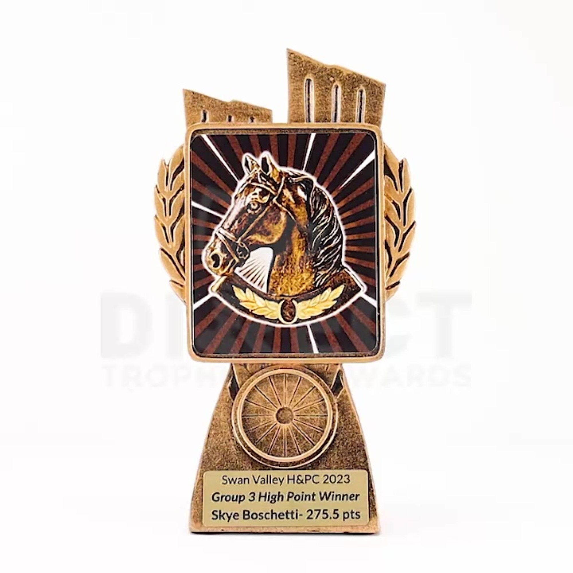 This Antique Gold Lynx Trophy is the perfect theme award for a variety of horse related activities. Featuring a classic wreath and vibrant design, horse trophies are customisable and available in 4 impressive sizes.