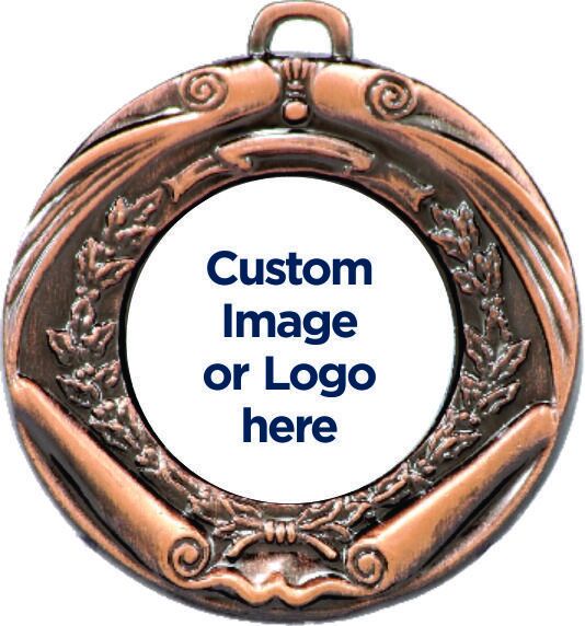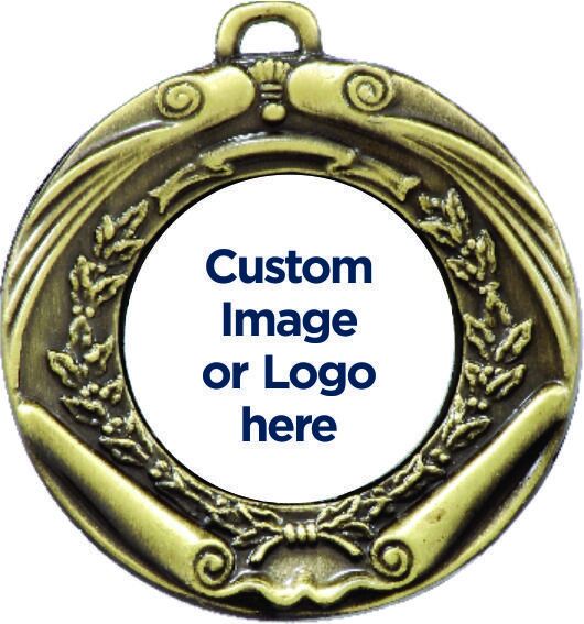Achievement medal with scroll and wreath design in traditional antique finish. Available in gold, silver and bronze. Inserts for all sports and consider personalised custom logo centres. Need to order separately to the medal. Ribbons in all colours and medal presentation boxes also available.