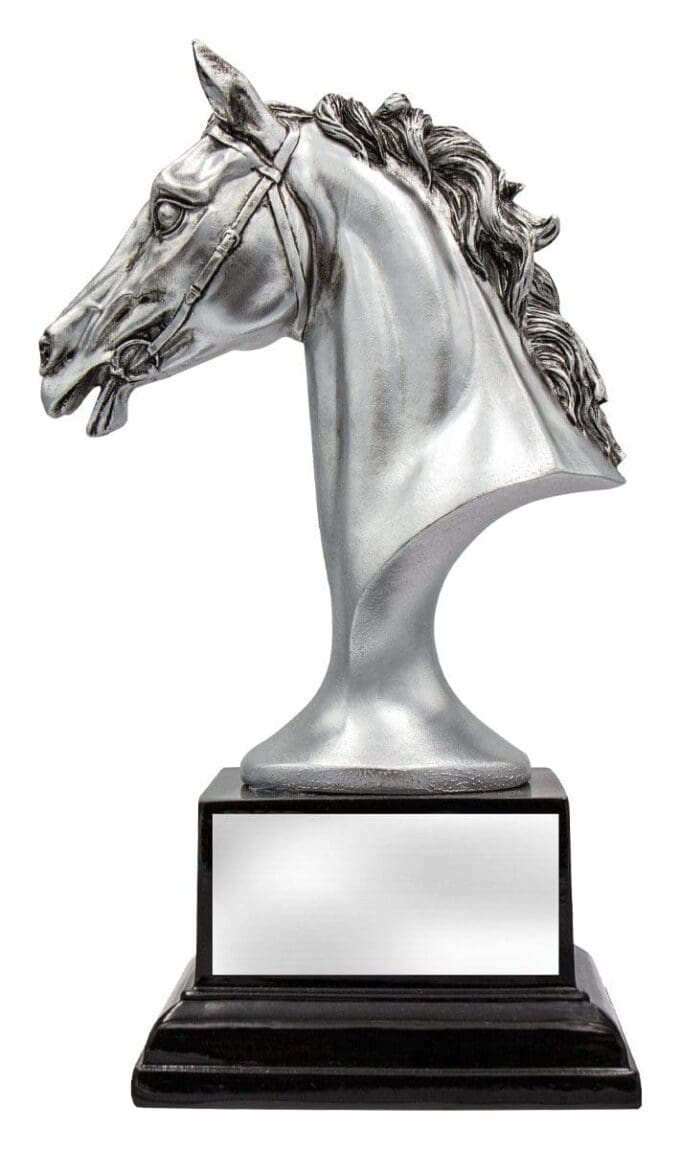 Introducing the Iconic Silver Horse Trophy: This popular trophy showcases the iconic horse head with remarkable detail and a striking silver color. Its vibrant appearance is enhanced by the classic black base, making it a prestigious award option. With free laser engraving, you can add a personalized touch to this remarkable trophy.