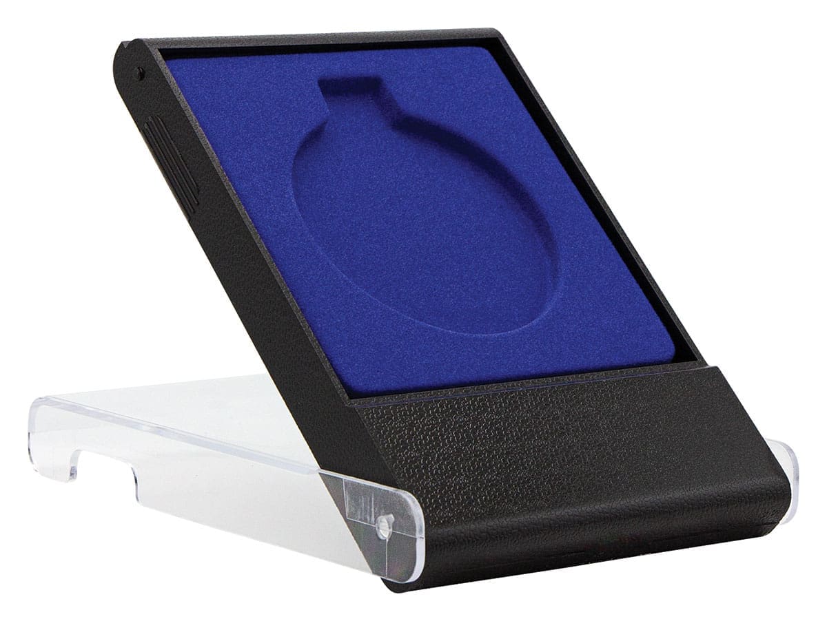 Discover the Indiclear Medium Medal Case, an elegant solution for your 60mm medals. This sleek black box features a blue felt inlay and a clear outer case, allowing you to proudly showcase your medals.