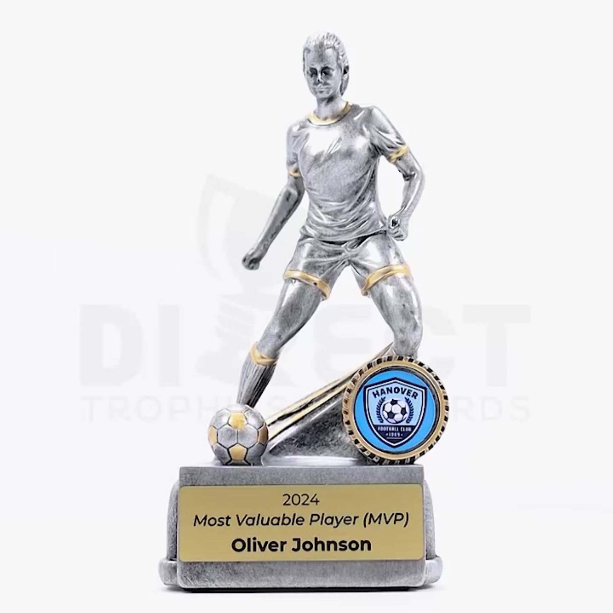Interlap Football Trophy: Highlight the man of the match or most valuable player with the Interlap Football Trophy, featuring a dynamic player passing the ball. With antique silver accents, it’s ideal for special recognition awards. Includes space for your custom image and complimentary laser engraving.