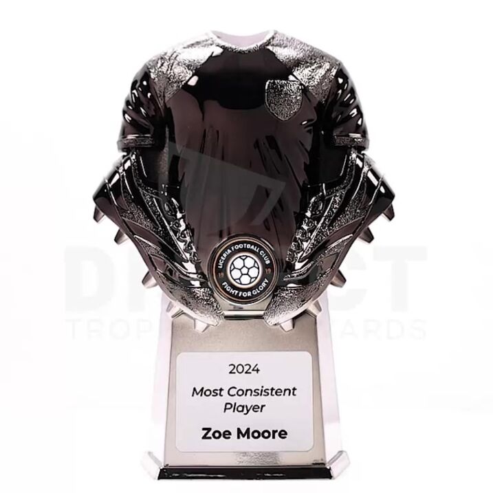 Invincible Football Trophy: Celebrate excellence with the Invincible Football Trophy, featuring a football jersey and boots design with a bold black to silver fade. Ideal for special awards, it includes space for custom images and complimentary laser engraving.