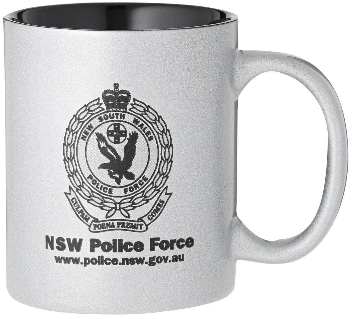 Silver ceramic coffee mug perfect for laser engraving for your text and logo requirements. Standard 325ml design. Silver outer coating and black engraving. A brilliant alternative for an award or trophy for your company or organisation.