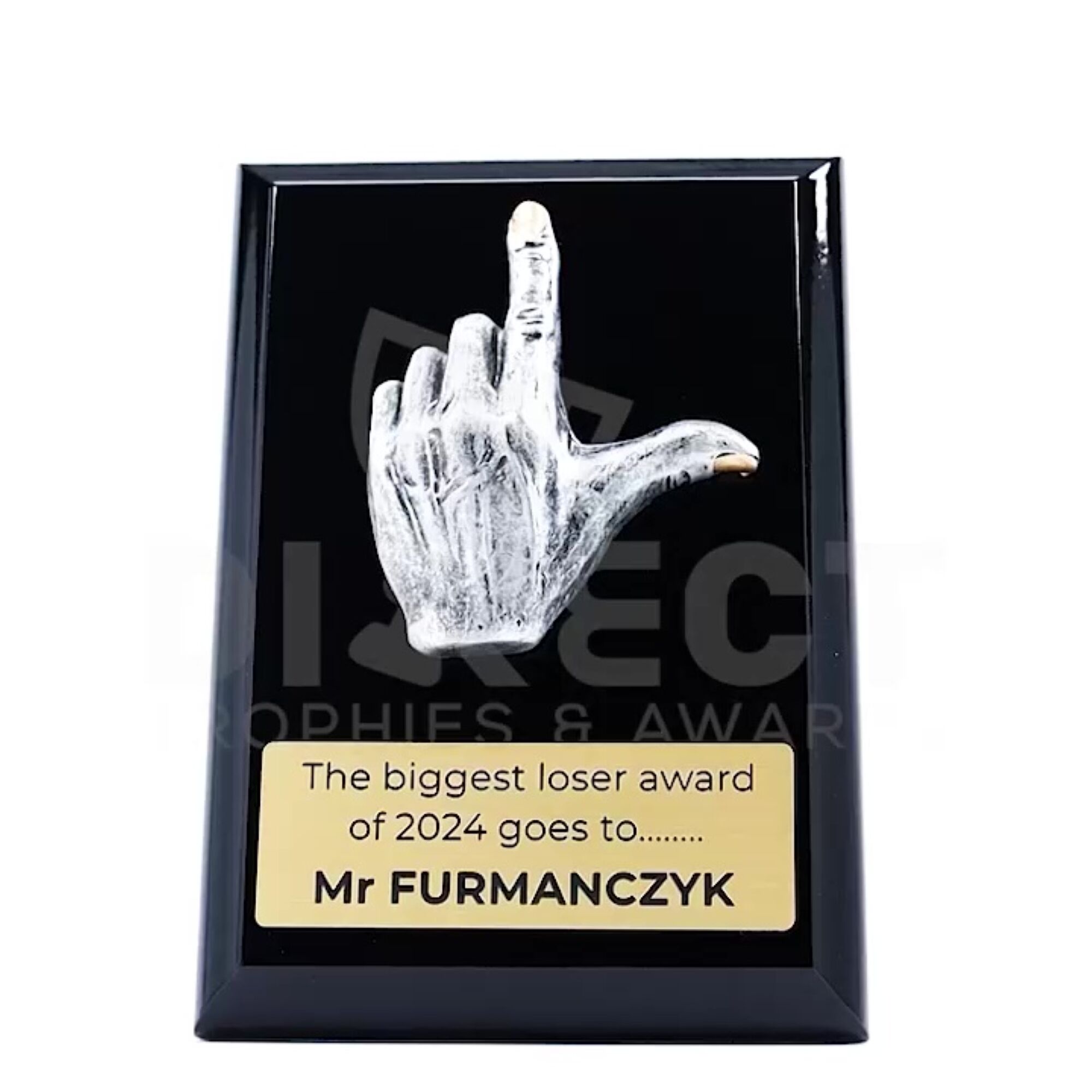 A classic black plaque with striking novelty front accompanied with a european gold plate showing black text engraving. Plaque includes silver screw on stand for display.