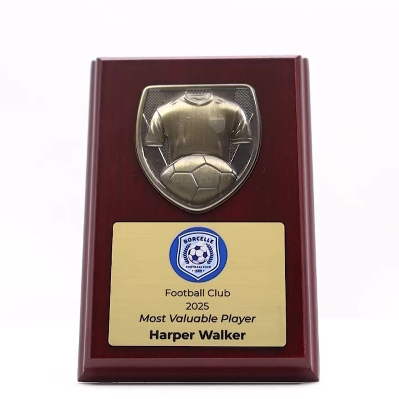 Metnox Trophy Plaque Series – Distinguished sports shield elegantly mounted on a rich rosewood plaque. Featuring a radiant antique gold crest, this award is perfect for recognising MVPs or valued participants. Gold plate can be customisable with your printed logo or image and award description.