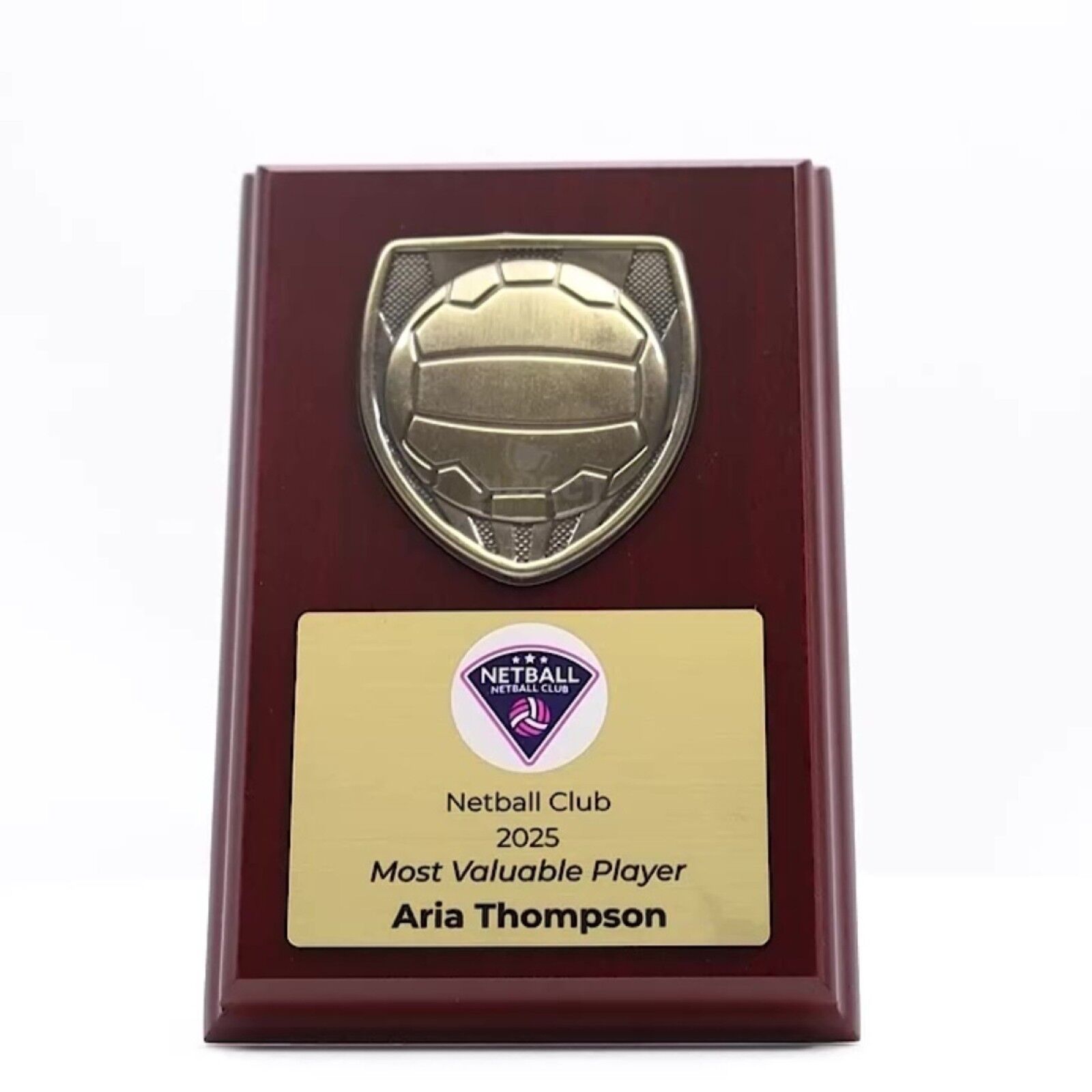 Metnox Trophy Plaque Series – Distinguished sports shield elegantly mounted on a rich rosewood plaque. Featuring a radiant antique gold crest, this award is perfect for recognising MVPs or valued participants. Gold plate can be customisable with your printed logo or image and award description.