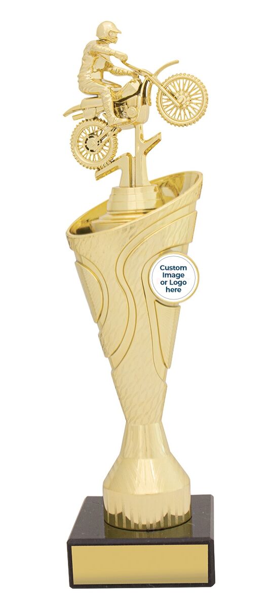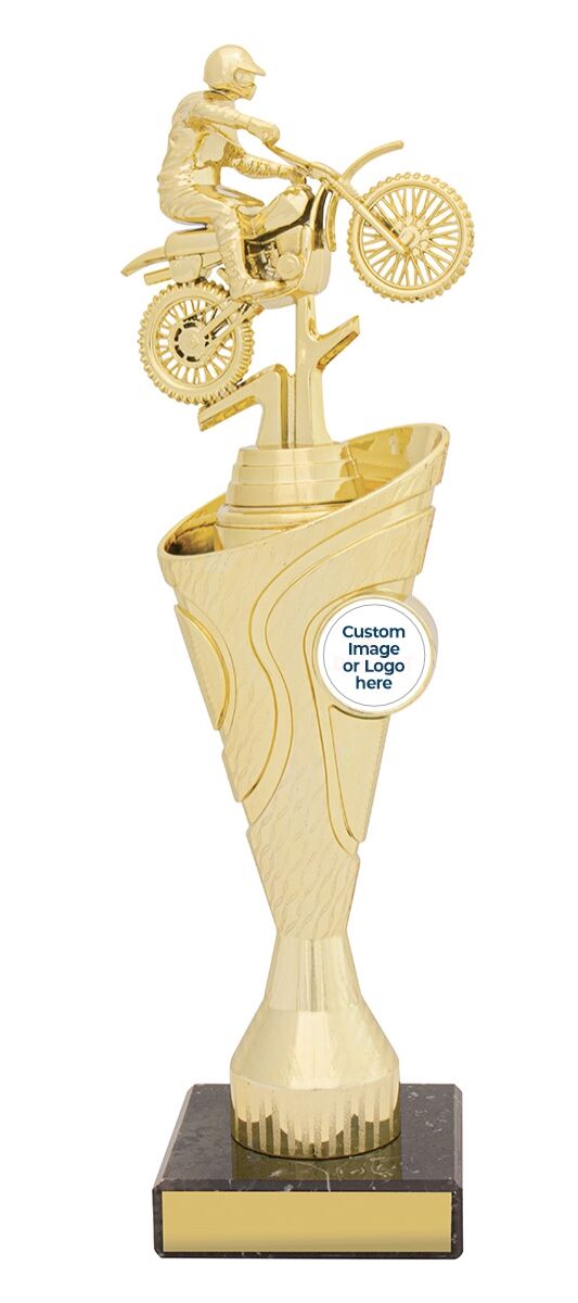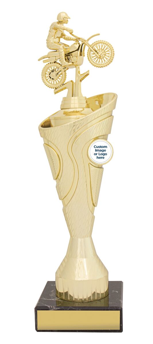 Introducing the Motocross Motiva Gold Trophy, an elegant and versatile choice. Available in multiple sizes, it features a brilliant trophy riser design and classic black marble. Celebrate success with Motiva.