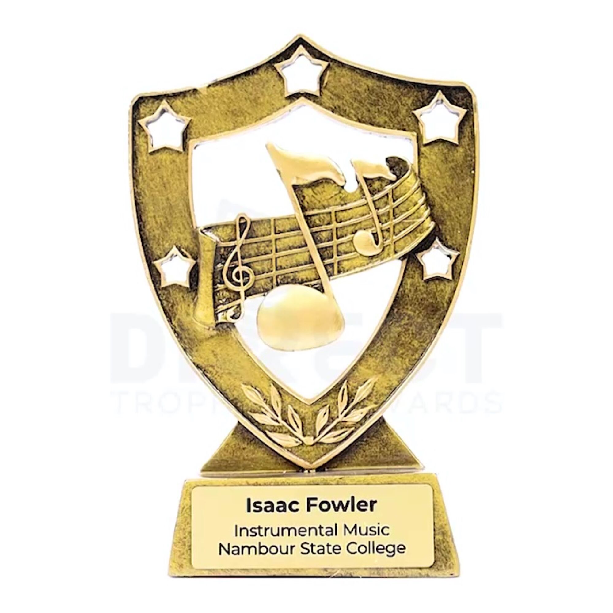 Classic wreath and shield inspired design, the Music Shield is an affordable and popular award choice. A versatile theme award – finished in antique gold – that is available in 3 convenient sizes.