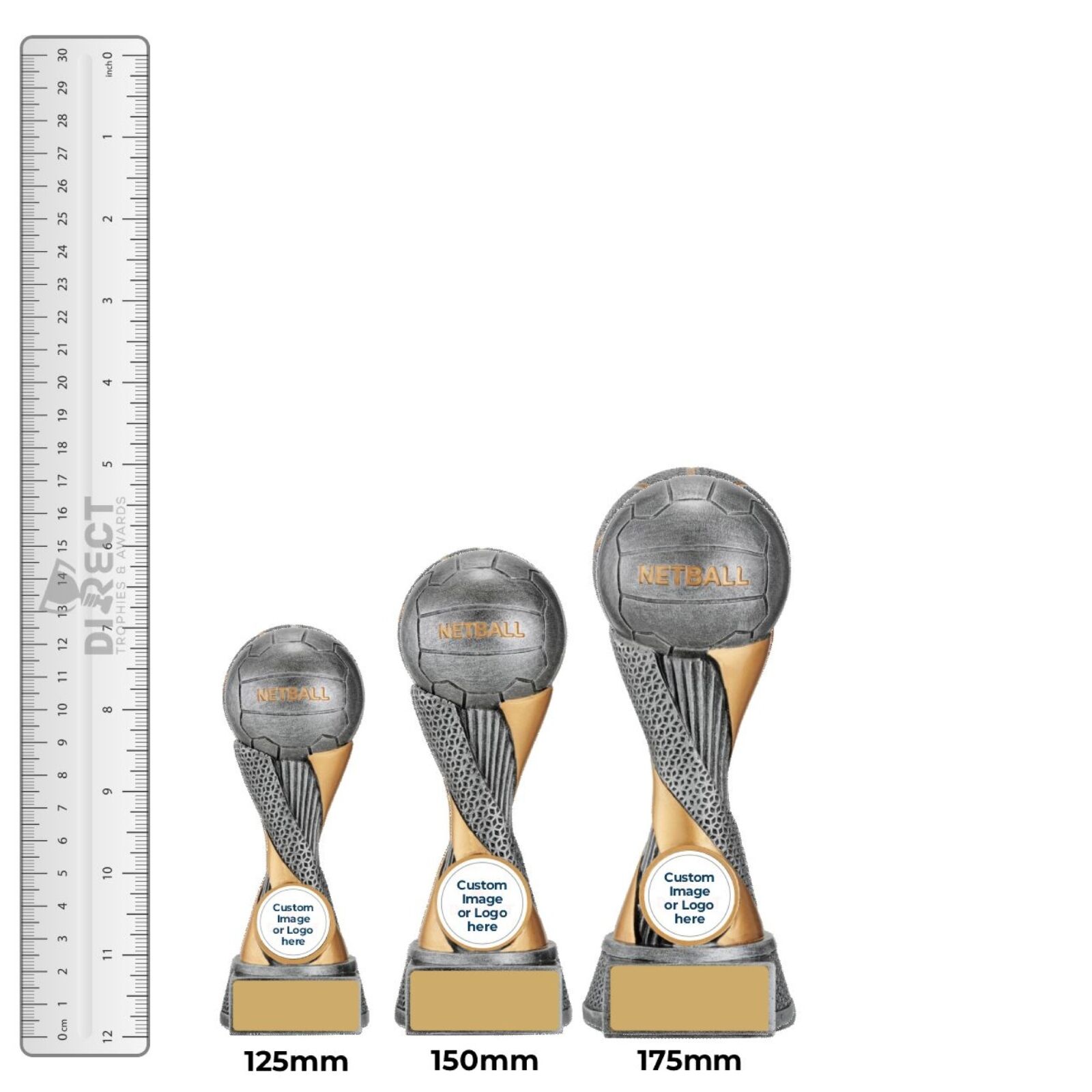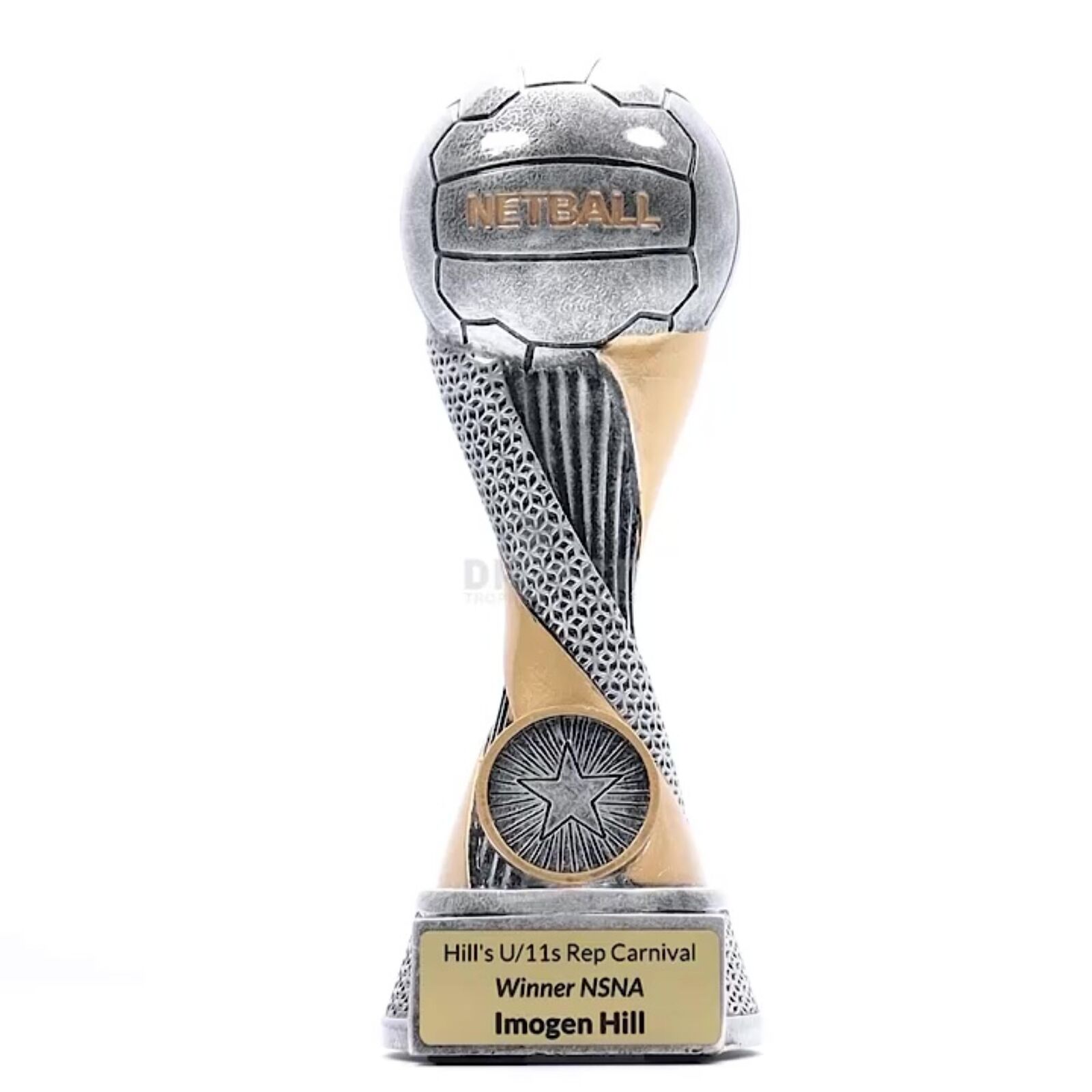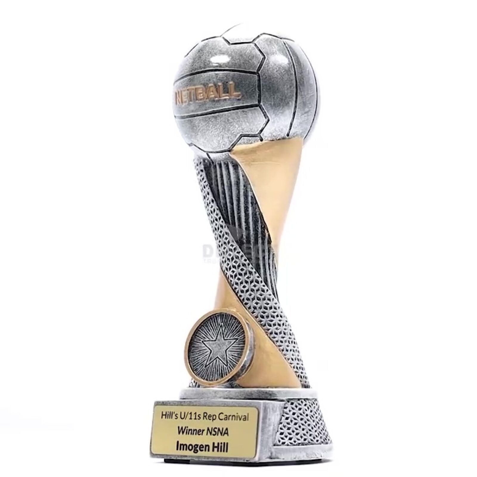 Apex trophies for Netball offer the combination of elegant design, multi-textured elements and brilliant silver & gold colours. Central space for your logo.