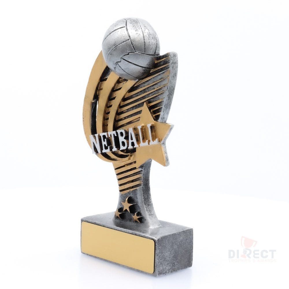 Striking design for your netball trophies that feature a prominent rising ball element and finished in classic antique silver and gold colours.