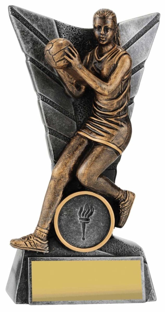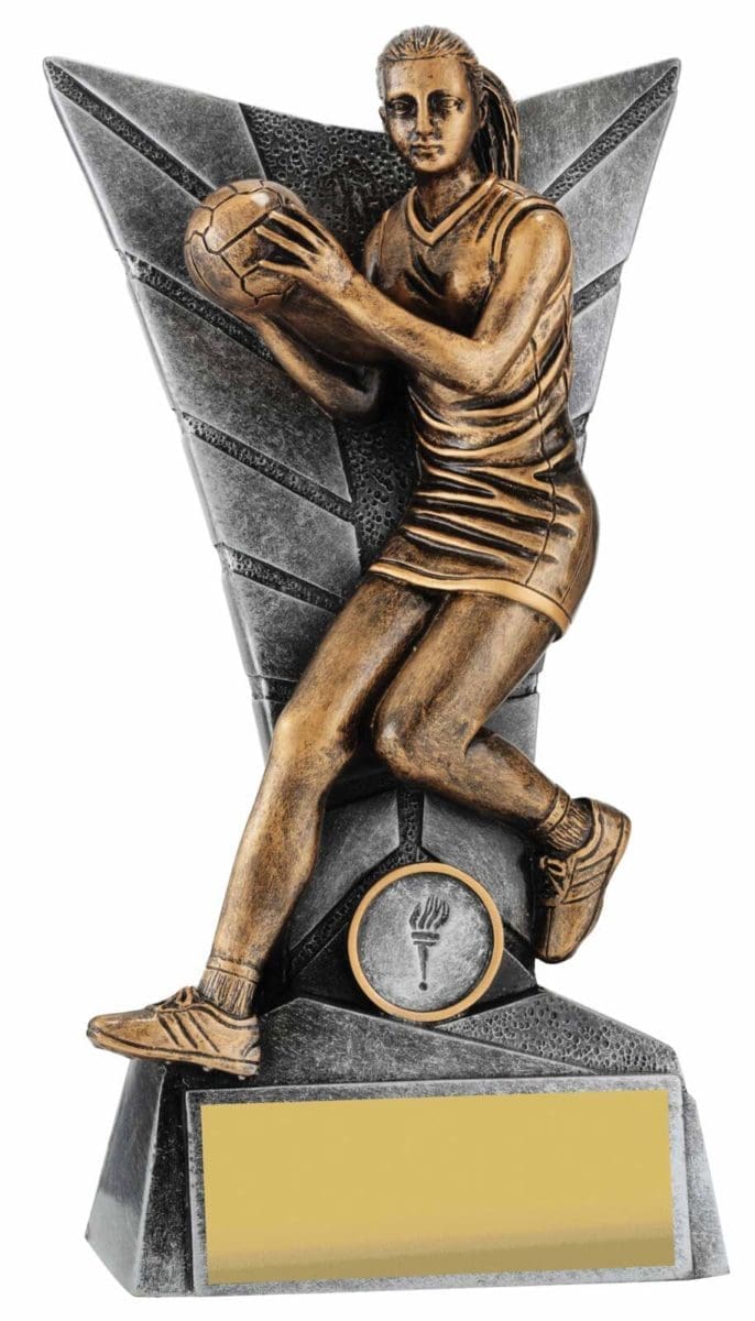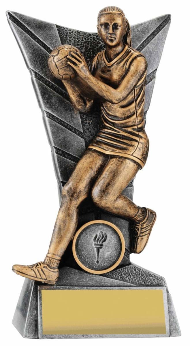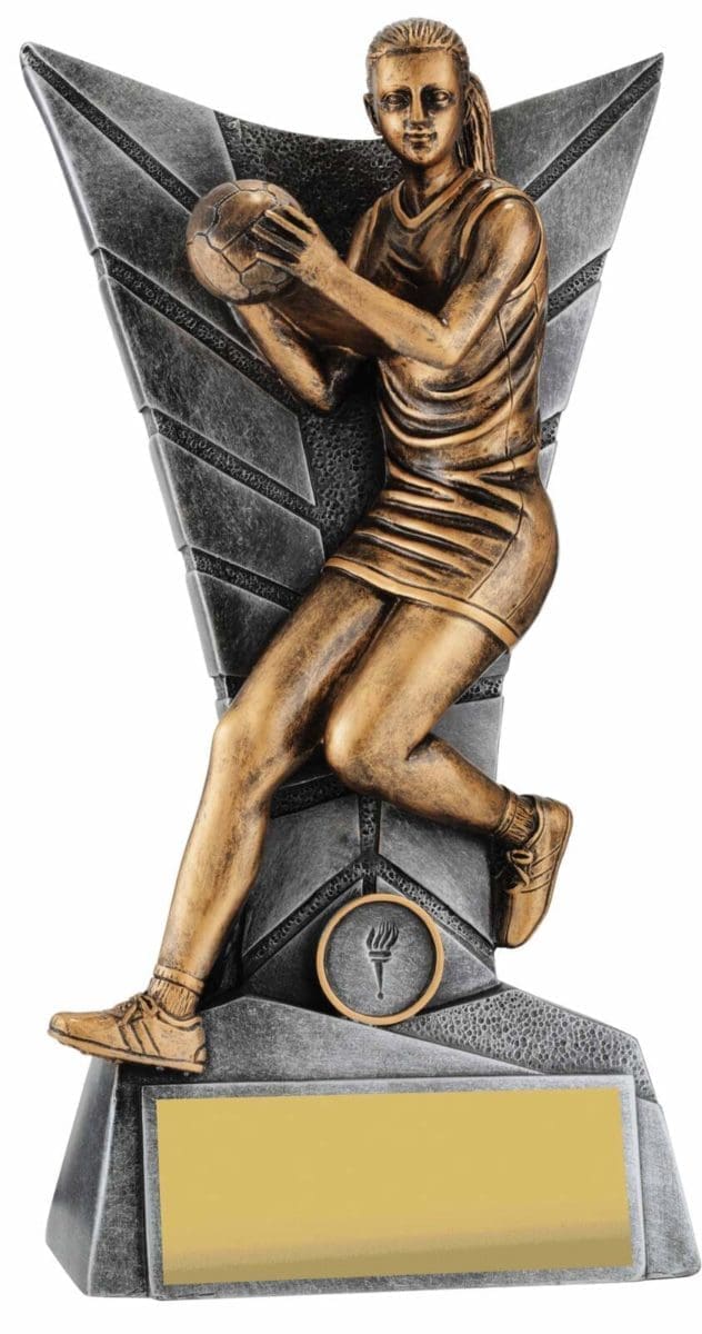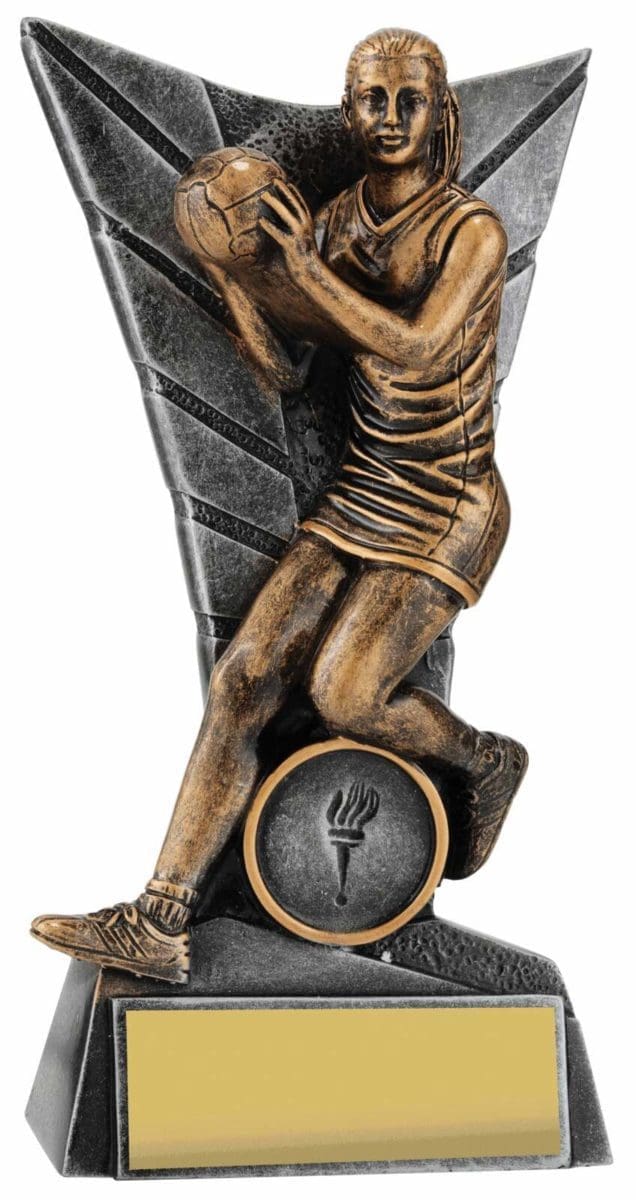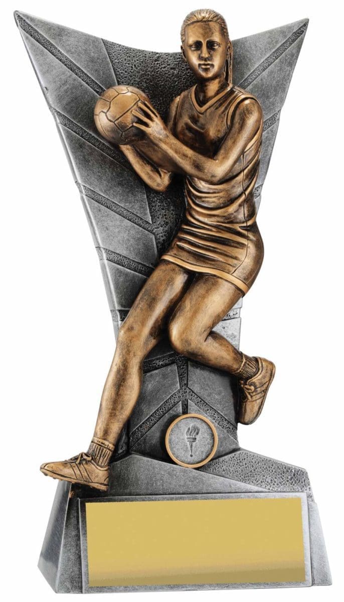 Elegant silver backdrop for this trophy series frames a detailed Netball player captured in action. Finished in antique gold, this player series is available in multiple sizes to suit your award needs. Excellent choice for best player trophies for your team or club.