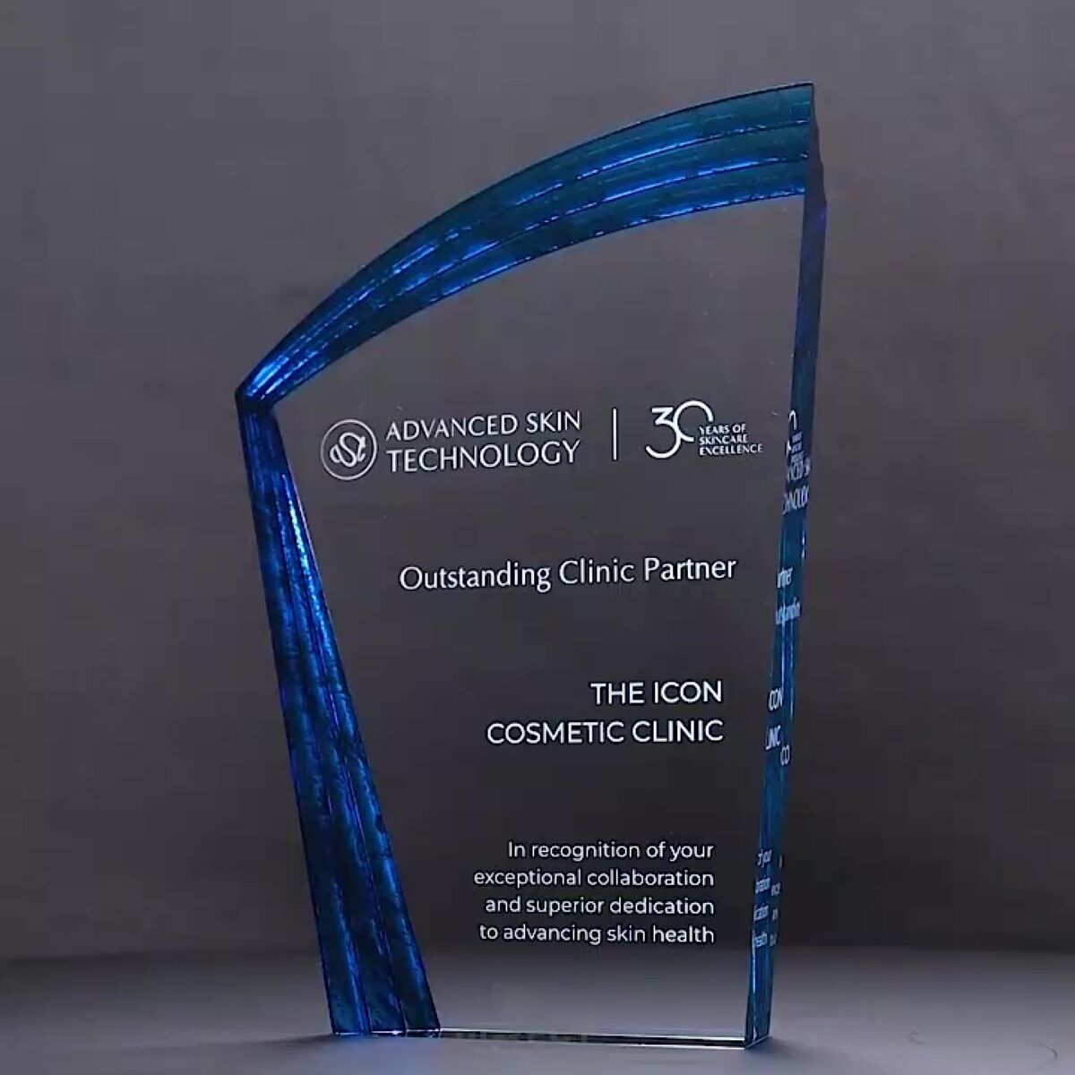 Features striking acrylic awards with vibrant, multi-coloured accents. Designed with generous areas for customisation, each piece is delivered in an elegant gift box and includes precision laser engraving.