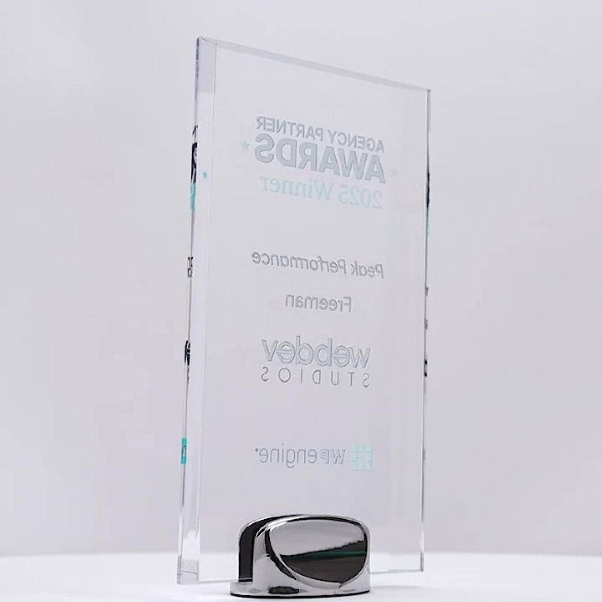 The Nucleus Acrylic Trophy combines refined acrylic craftsmanship with a sleek metal base, offering a prominent central area for full colour print. Delivered in a stylish gift box, it includes laser engraving to enhance its elegance.