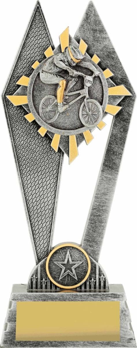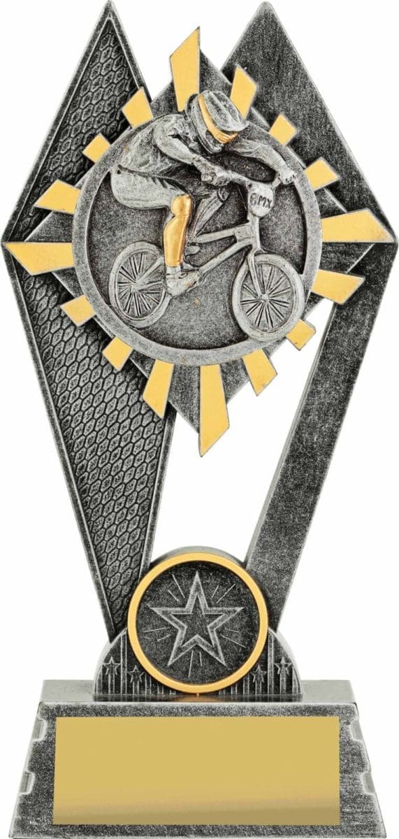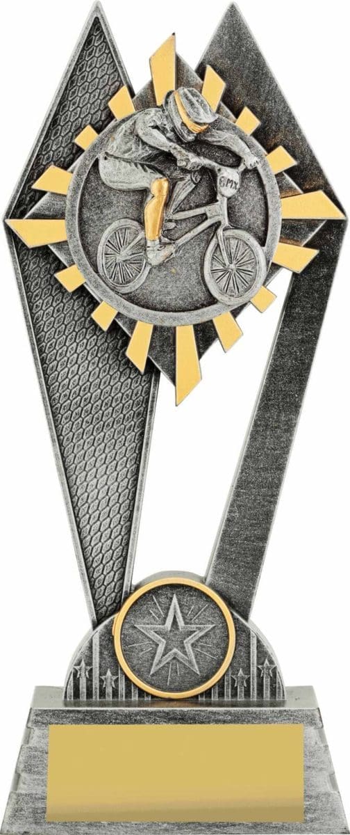 The Peak Series is an innovative trophy series offering super value for such an impressive size range. An elevated design that showcases a BMX rider in action against a vibrant sunray style background. Available in 3 sizes.