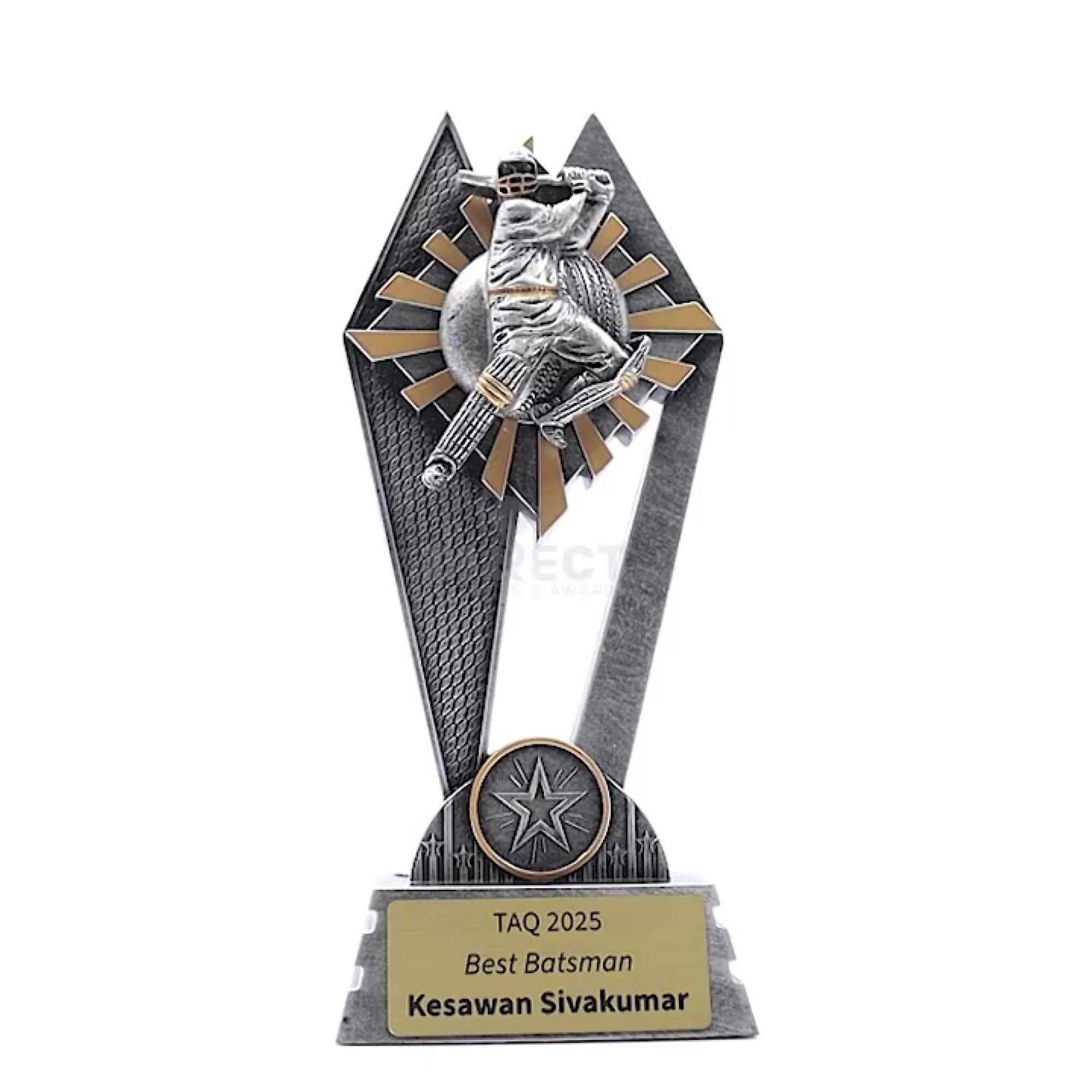 The Peak Series – for Cricket – is an innovative trophy series offering super value for such an impressive size range. An elevated design that showcases a male batsman theme against a vibrant sunray style background.
