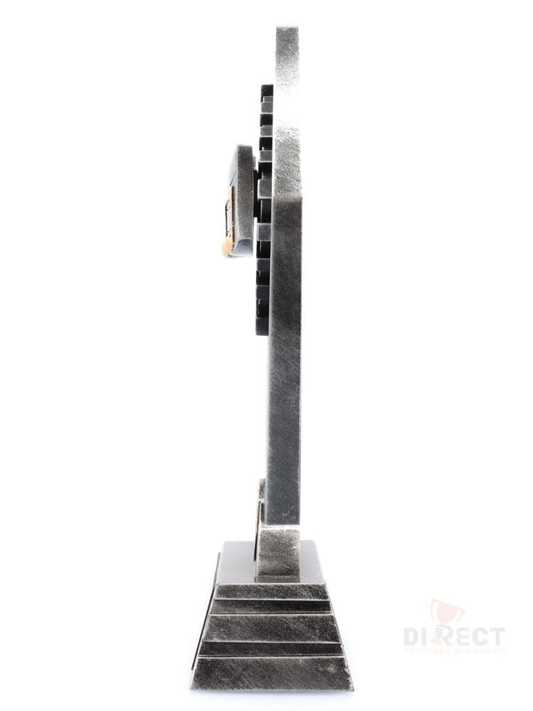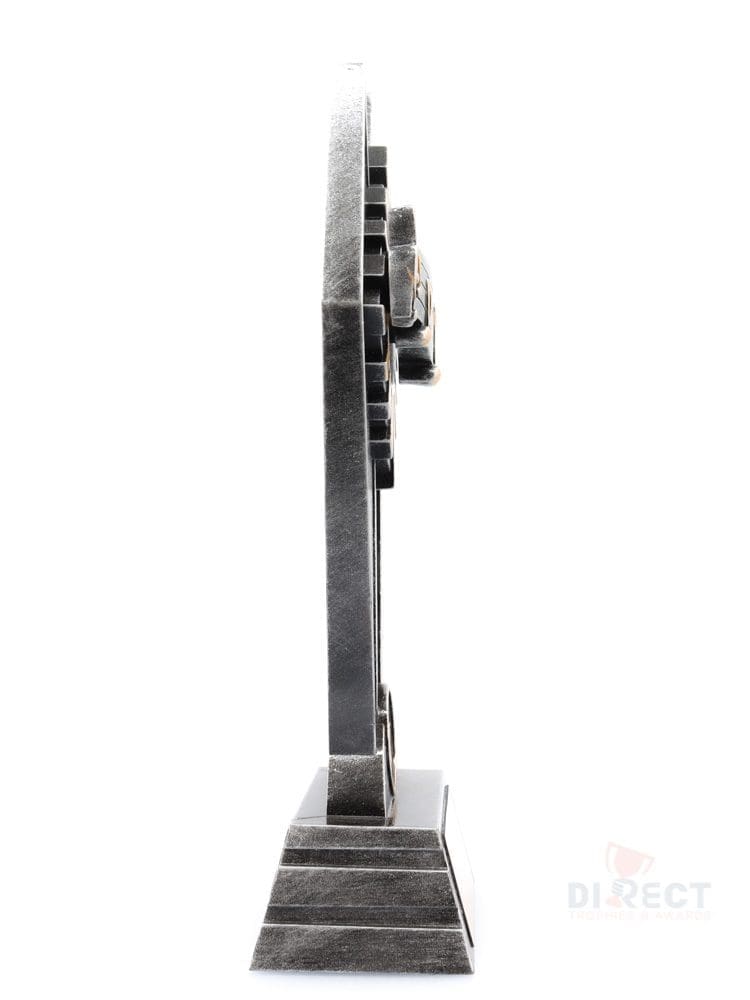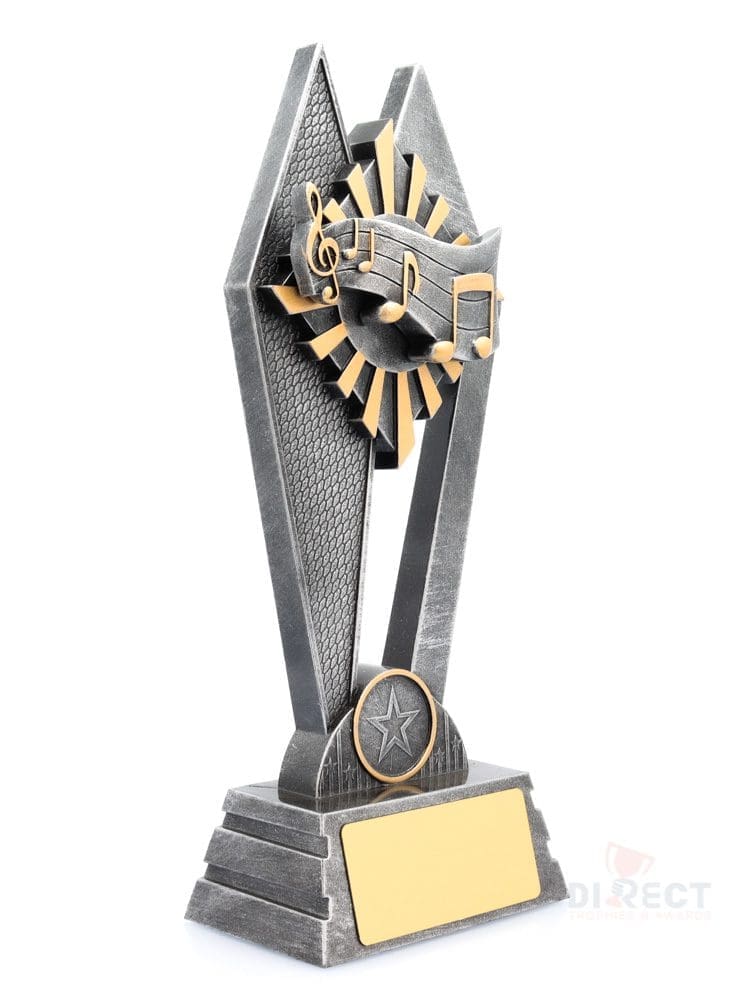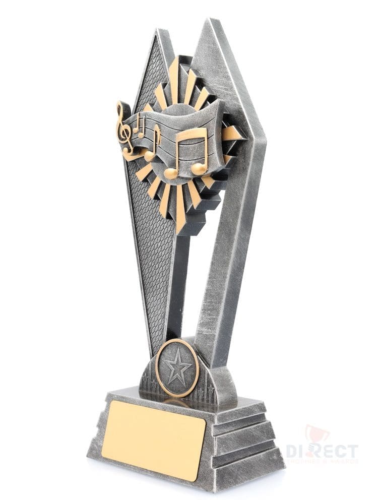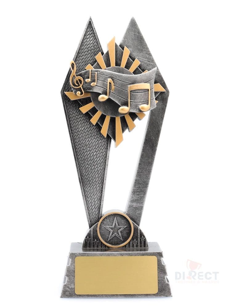 Peak style trophies – for Music – offer fantastic value for bigger series of trophies available in 3 sizes. Design showcases key elements for Music against vibrant sunray background. Trophies finished in classic antique silver and gold highlights.