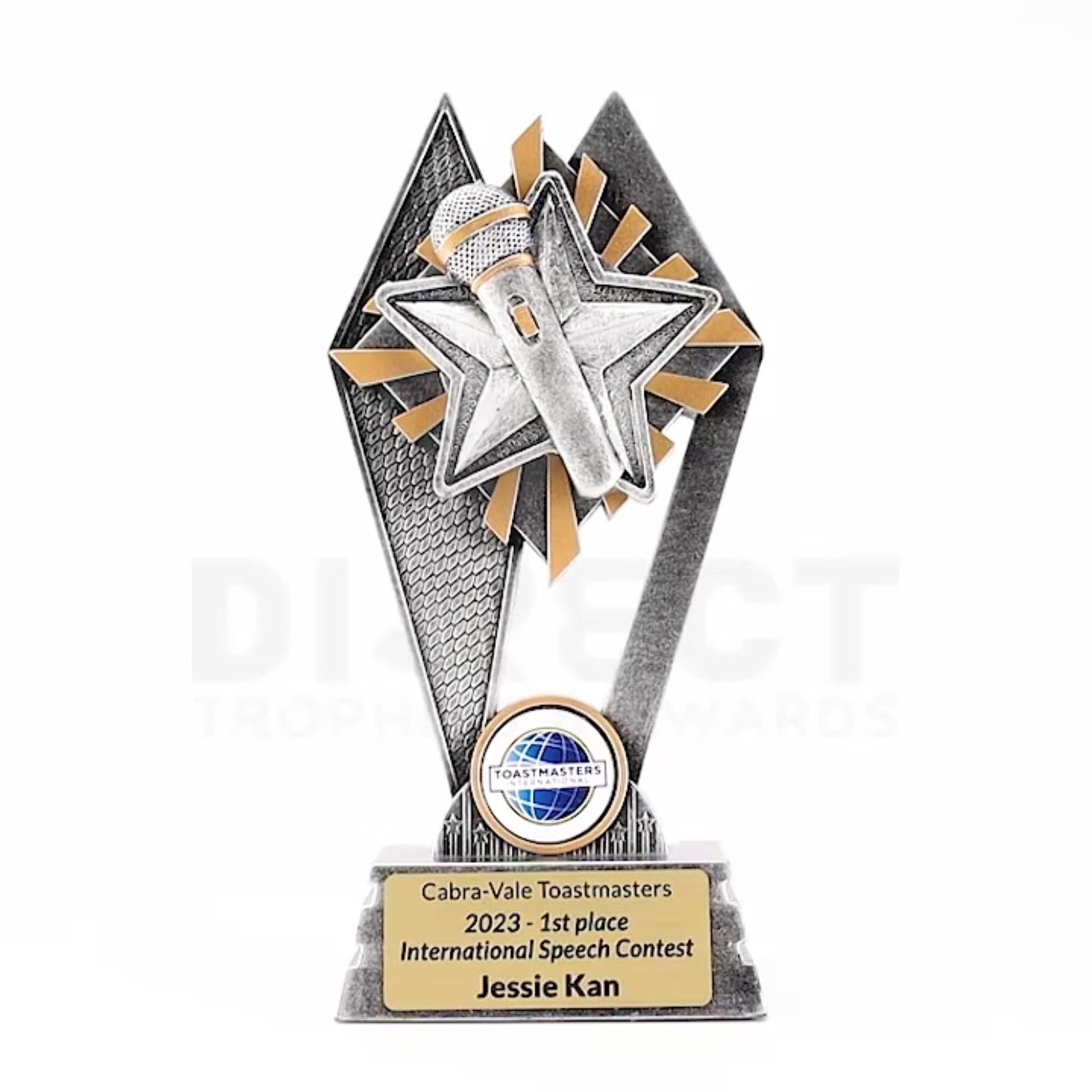 The Peak Series is an innovative trophy series offering super value for such an impressive size range. An elevated design that features a microphone theme can be used for public speaking, debating and other activities. Available in 3 sizes.