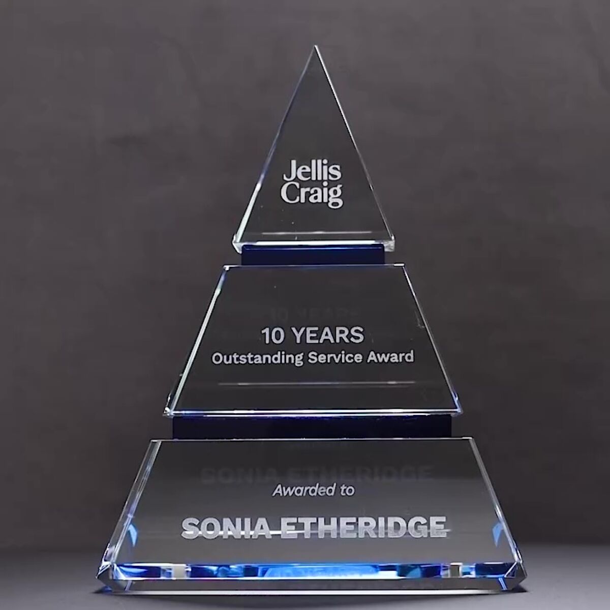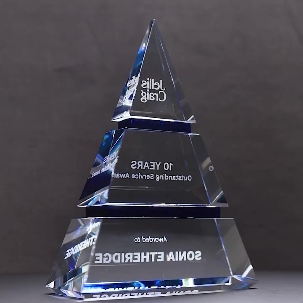 Crystal award part of the Phoenix Crystal Award Range that offers the best in execution and design for corporate and business style trophies and awards. The Blue Pyramid is a truly bold and standout piece that will be perfect for elite trophy presentations. Available in gift box.