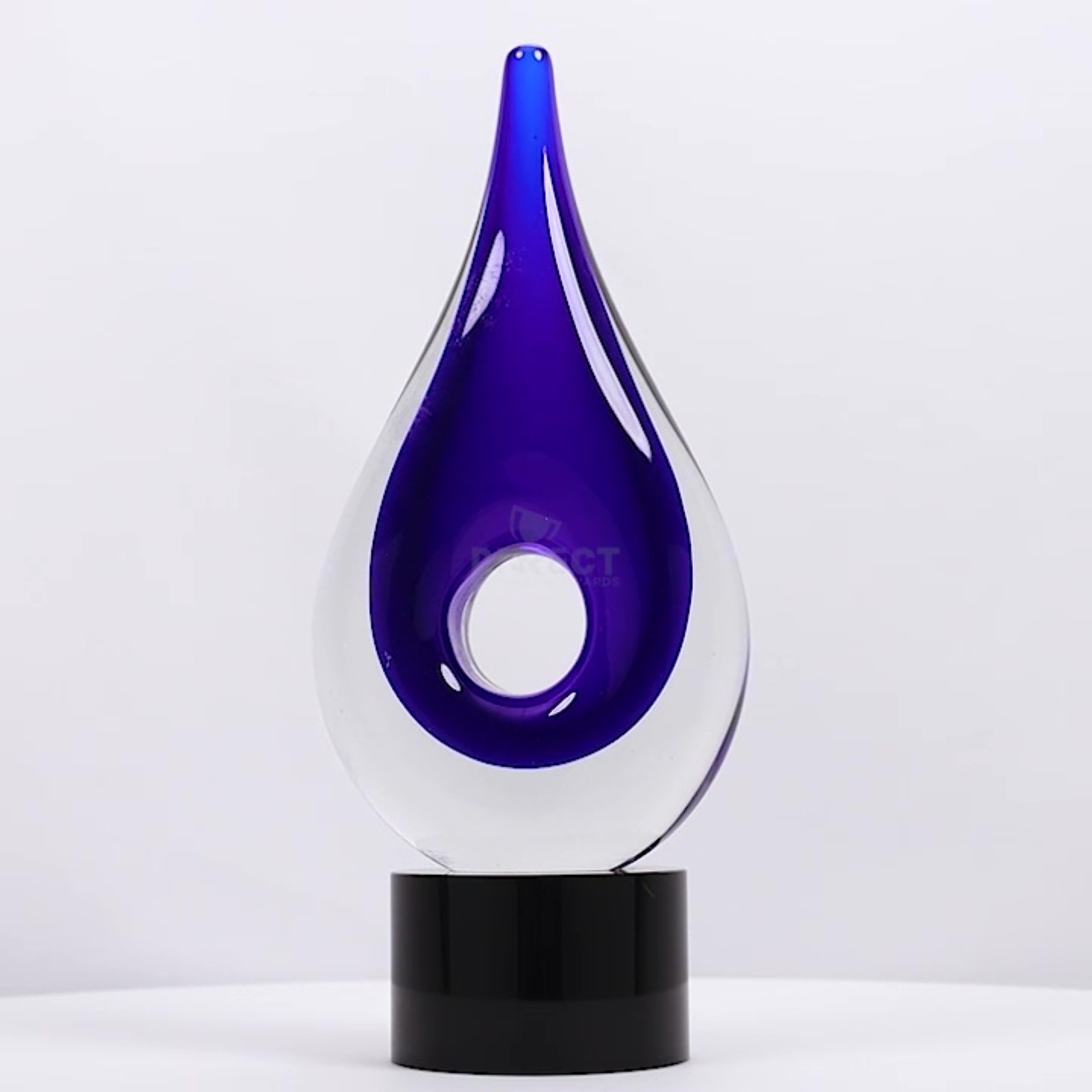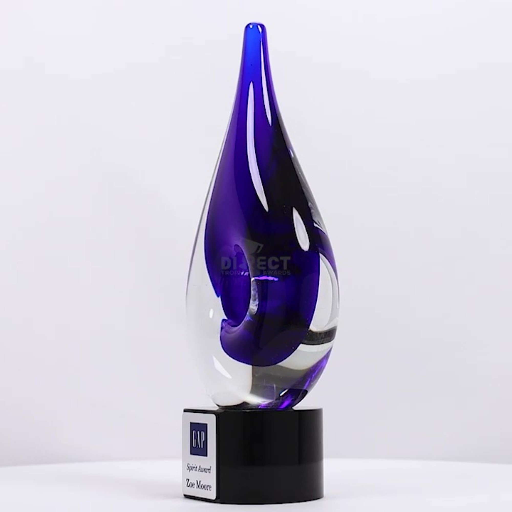 Majestic art glass award, the Plume features different hues of blue, gravity defying design and premium crystal base for your engraving.