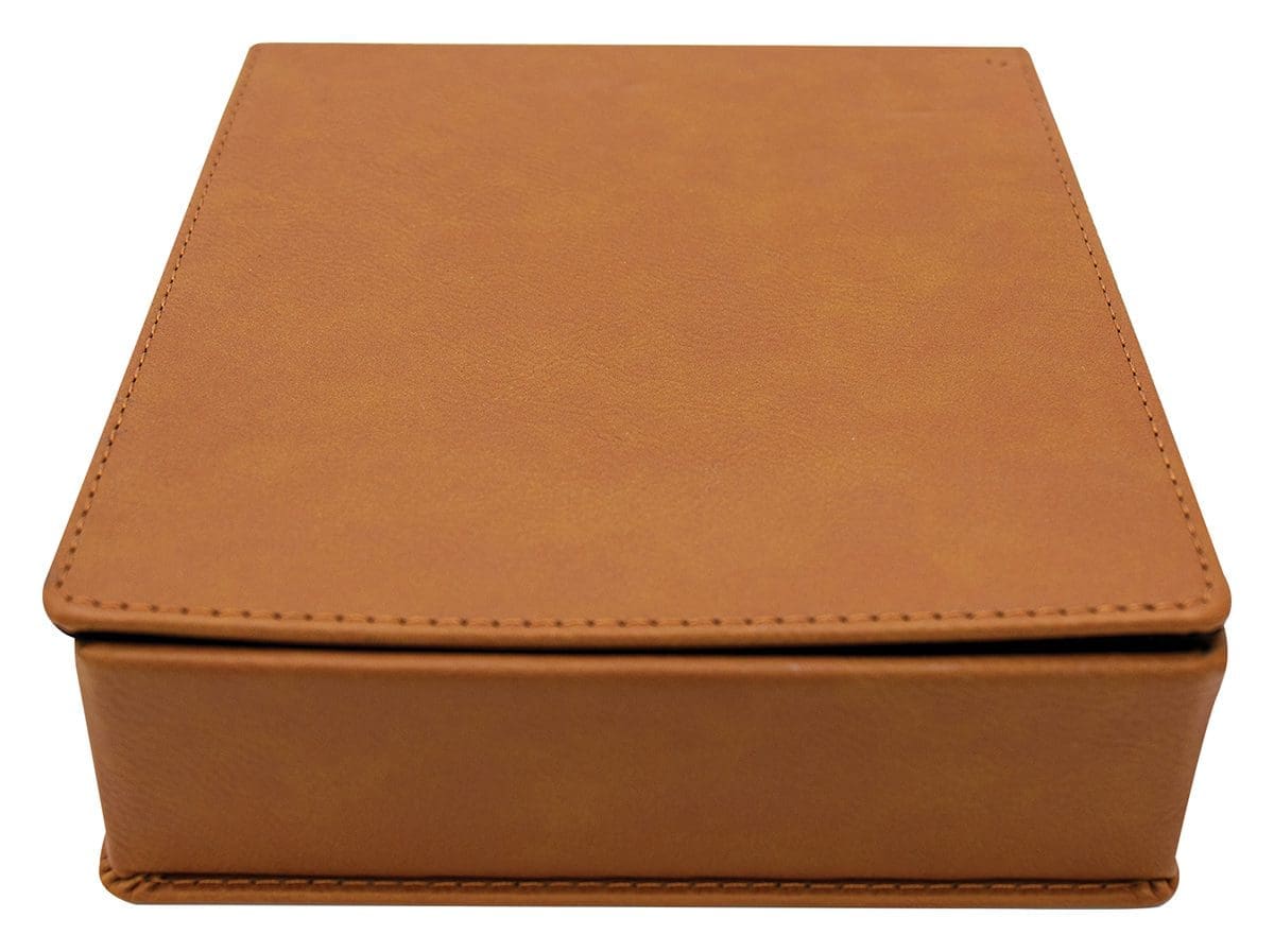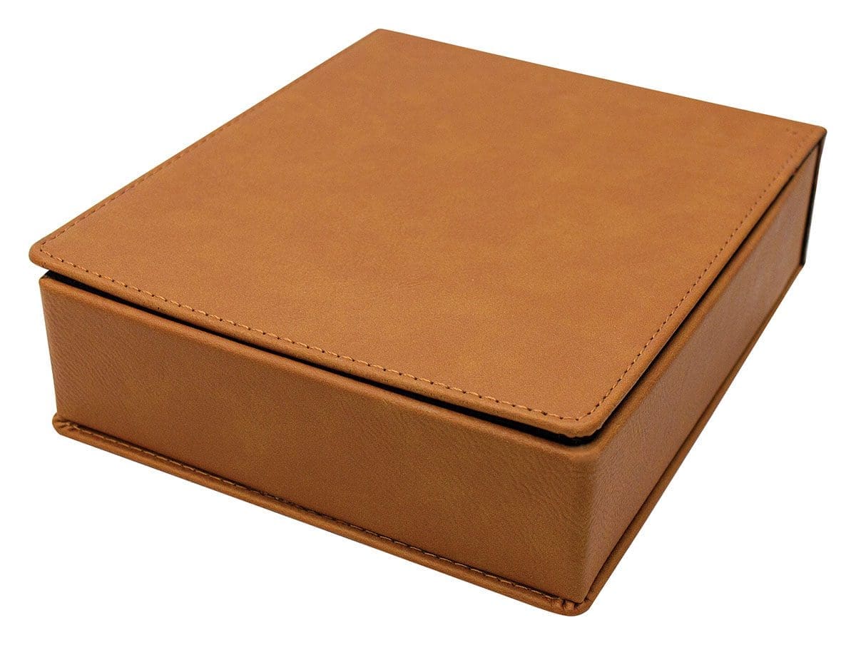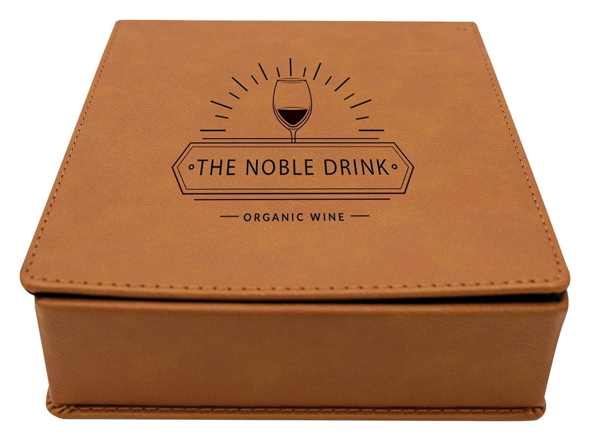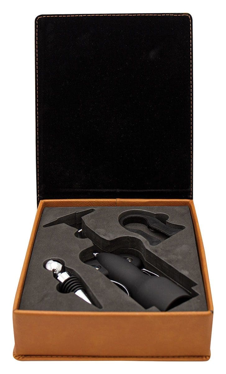 Gift Set includes premium bottle opener and stopper with rawhide leatherette cover for your engraving requirements.
