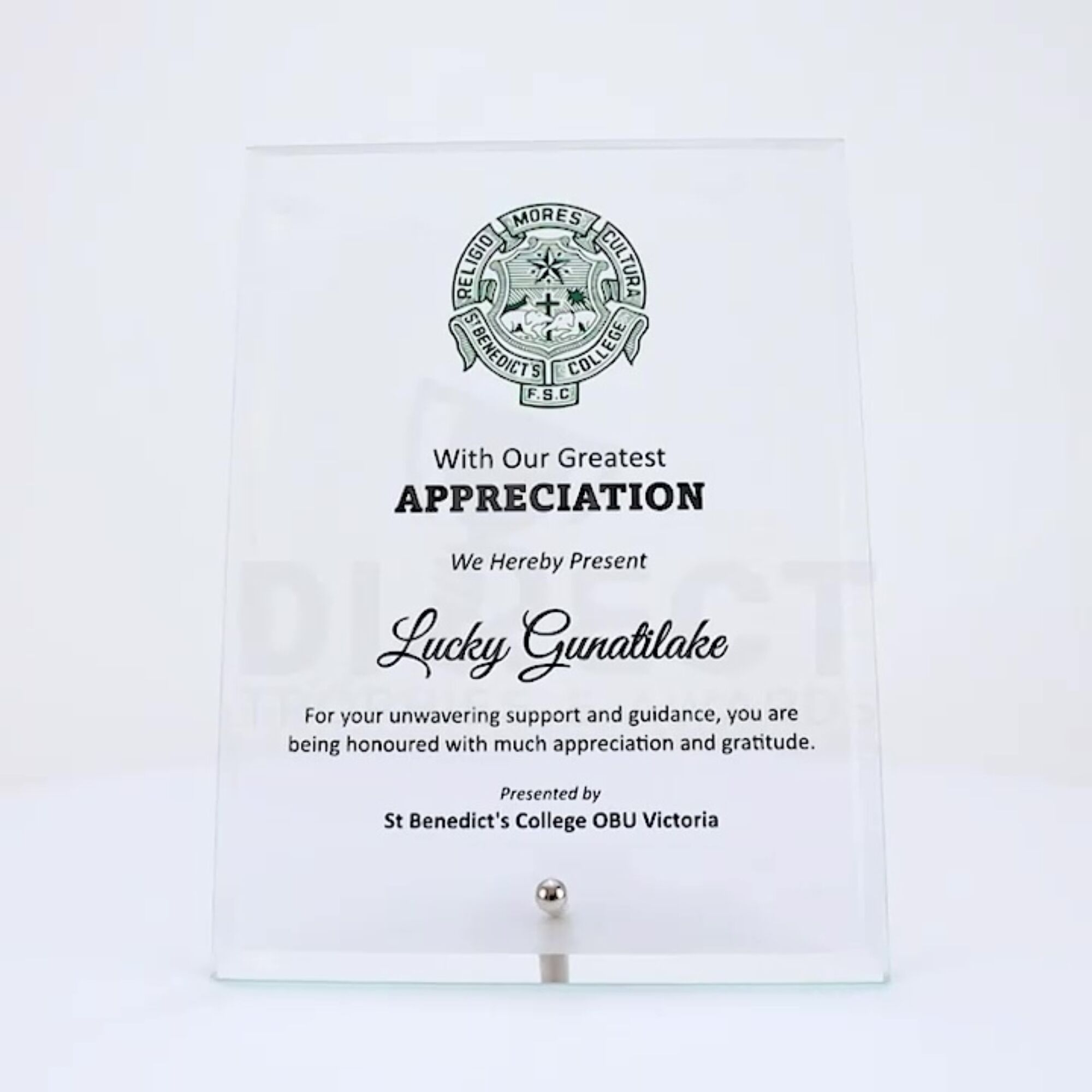 The Prime Glass Plaque series is a prestigious award option presented in a premium gift box. clear glass plaques available in 3 convenient sizes present a universal award to showcse your colour printing