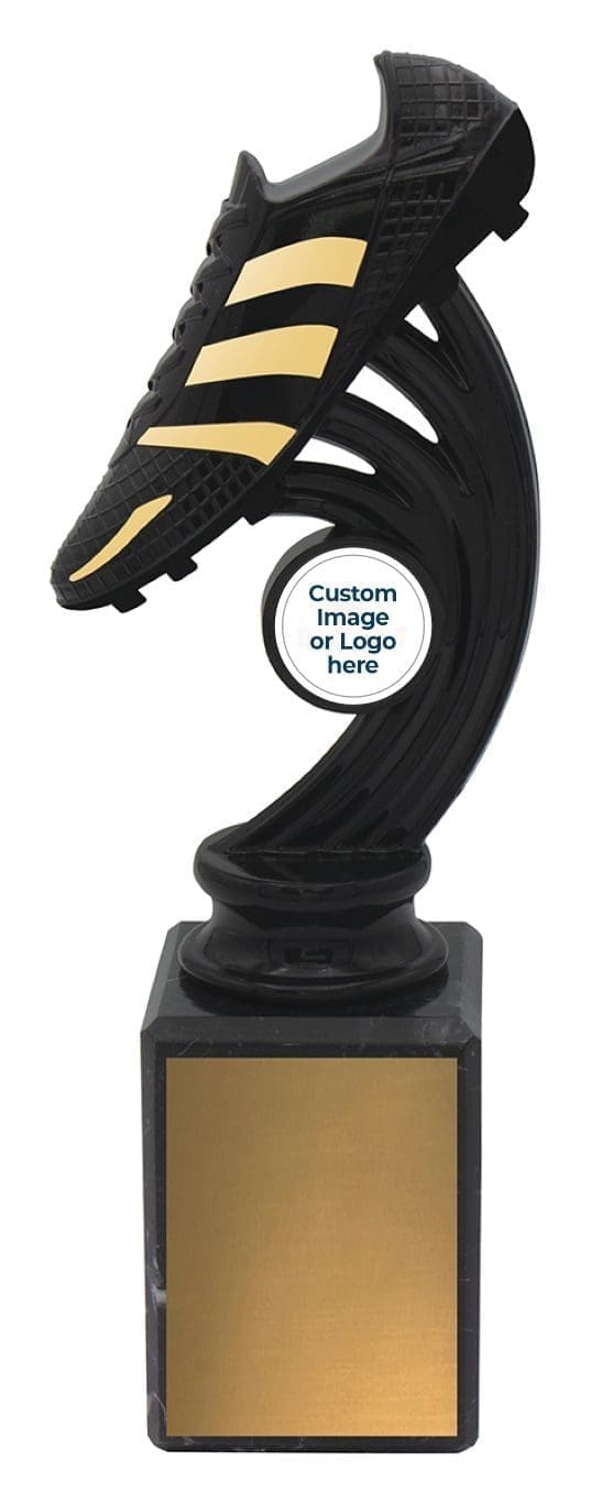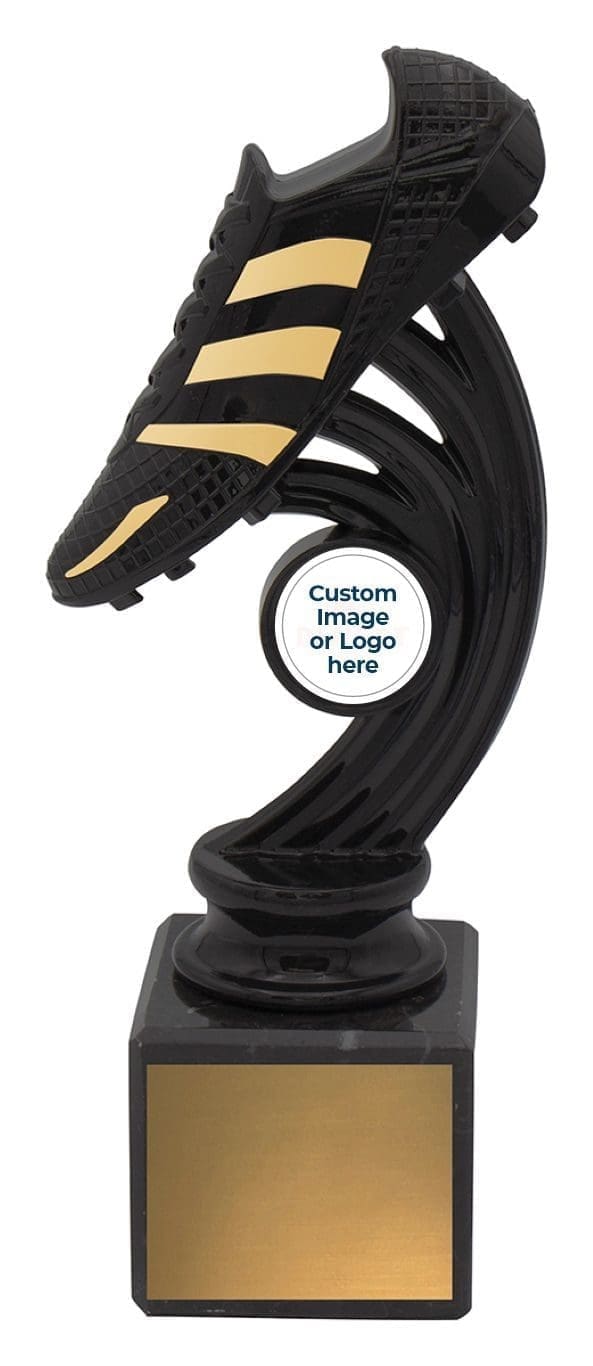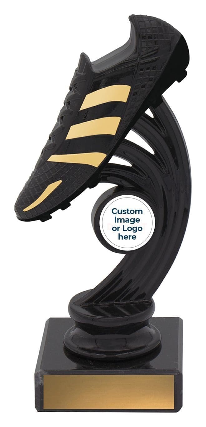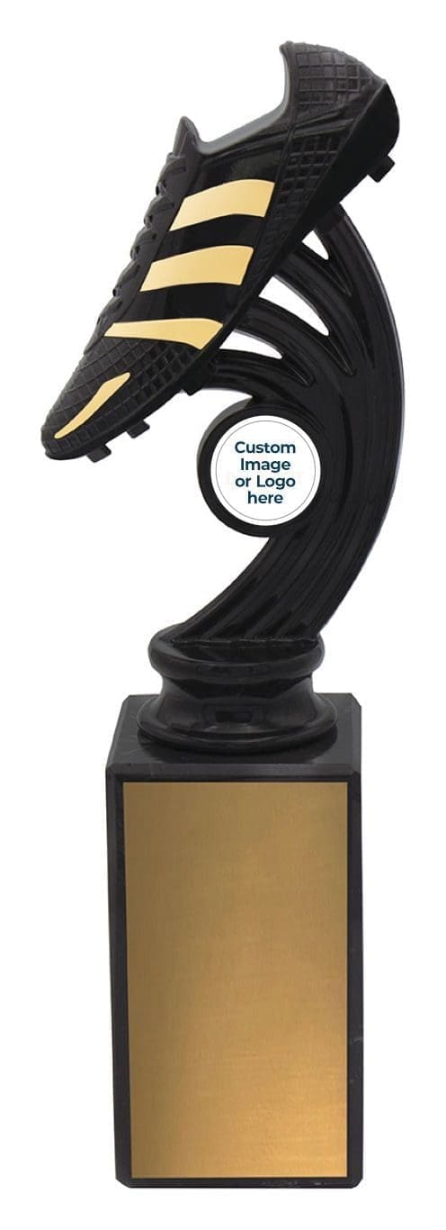 Introducing the Rattler Black Gold Boot Trophy, a captivating series of trophies showcasing a realistic boot in motion with a striking black and gold color combination. Available in multiple sizes, this trophy is the perfect choice for recognizing outstanding achievements. Personalize it with free laser engraving for a truly memorable award.